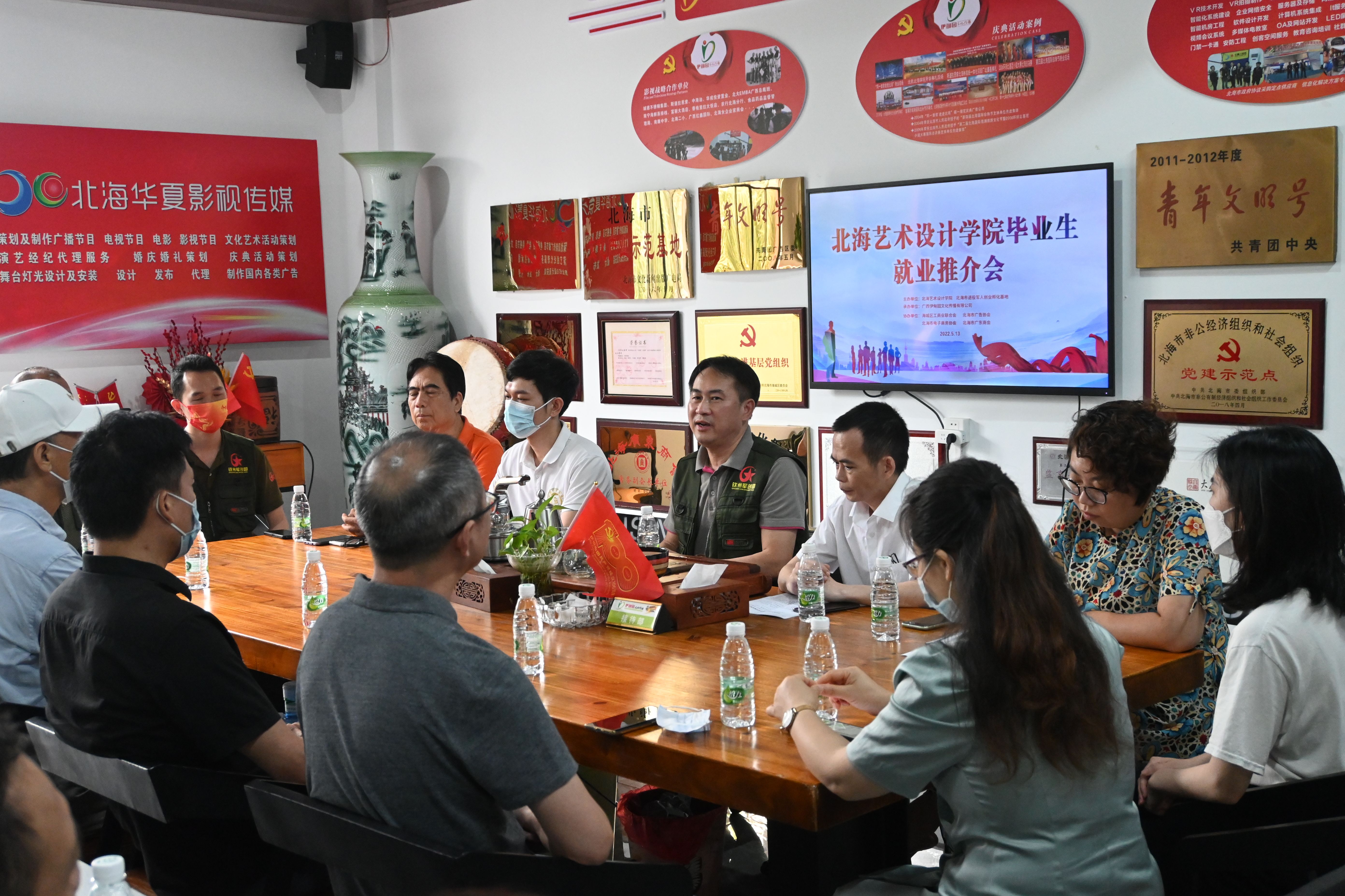 2022年5月13日下午,我校校长卢新华,副校长王斌、陶立阳、邱杰以及招生就业处、教务处、学工办、创新创业学院等部门代表赴北海市退役军人创业孵化基地参与人文教育学院举办的毕业生就业推介会。