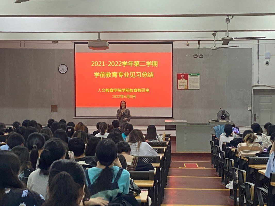 教育见习结束后,学前教育教研室于6月8日晚组织学生召开2021-2022学年第二学期学前教育专业见习总结会。总结会上,学前2002班学生乔阳代表全体教育见习同学发言,乔阳同学围绕本次教育见习谈了收获和体会。冯小霞老师对本次教育见习进行总结,肯定了同学们的表现,指出不足,勉励同学们改正不足,争取更大的进步。学前教育教研室副主任蒙剑英老师发表讲话,希望同学们针对本次教育见习认真做好总结,对标合格幼儿教师,查找差距,完善自身,争取早日以合格幼儿教师的身份在走上岗位。 (照片:学前教研室)