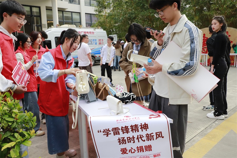 学校通过弘扬学习雷锋精神、践行雷锋精神,融合课程思政及学生实践弘扬时代新风,结合专业特色发挥专业优势,书写雷锋精神、绘制雕塑雷锋像、演绎雷锋故事、诵读雷锋日志、设计雷锋精神相关文创与影视动画作品等形式让雷锋精神全面系统融入日常课程之中,不断引导广大师生见贤思齐,矢志不渝传承雷锋精神。在直播活动中,“歌舞快闪”“爱心义卖”“‘雷锋精神’学习作品创作展示”等活动开展得如火如荼。师生集体齐唱歌舞节目《学习雷锋好榜样》,歌声铿锵、舞姿优美,现场互动热烈,在欢快气氛中深刻领悟雷锋精神内核;学生纷纷拿出手工制品进行校园爱心义卖,并将义卖所得捐赠到特殊学校进行爱心捐助,以实际行动传播爱心能量;学生通过现场书写、制作、绘制弘扬雷锋精神作品展示,诵读雷锋日志、讲述雷锋故事,传扬雷锋事迹,树立时代信念,让雷锋精神深入人心,滋养心灵。学校还组织开展“创城卫生清洁集中志愿服务”“敬老奉献”“北海银滩景区公益志愿服务”等活动,以实际行动宣扬雷锋精神。
