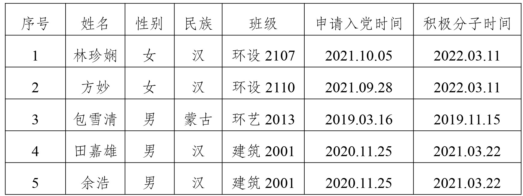 在征求党小组和党员、群众意见的基础上,经支部委员会审查,拟将林珍娴等5位同志列为发展对象人选。根据发展党员工作有关要求,现将其有关情况公示如下,经党支部培养教育和考察,该同志已基本具备党员条件,在征求培养联系人、党员和群众意见的基础上,经中共北海艺术设计学院建筑与环境艺术学院学生第二支部委员会2023年3月12日讨论同意列为发展对象人选。