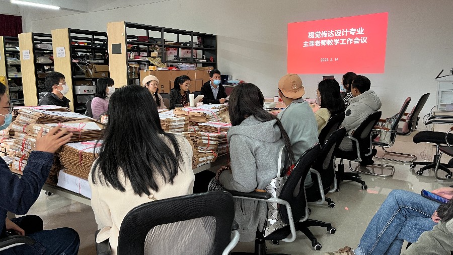 2023年2月14日上午,在伦理楼208工作室召开视觉传达设计专业主课老师教学工作会议,设计艺术学院教学副院长白建强主持,参会人员有二级学院副院长李佩、教研室主任张志以及各课程的主课教师。
