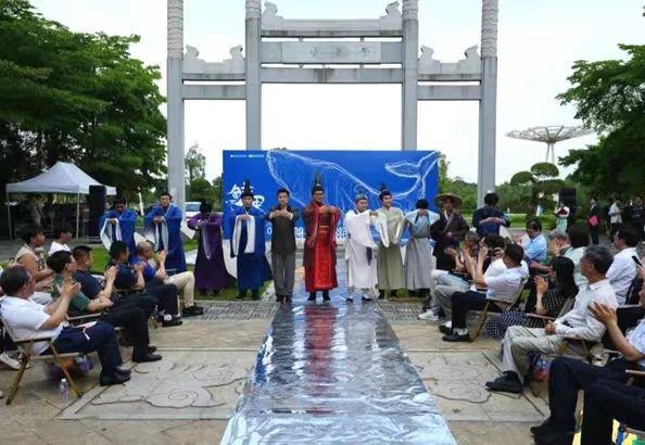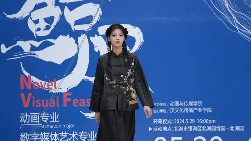 开幕式上,汉文化传播产业学院以独特的创意和匠心独运的设计,呈现了一场别开生面的走秀表演。学子身着自主设计,并采用中国传统布料香云纱精心制作的服装,将古典韵味与现代时尚完美融合,为整个“鲸界”动画&数媒作品艺术联展注入了更多元的文化元素。