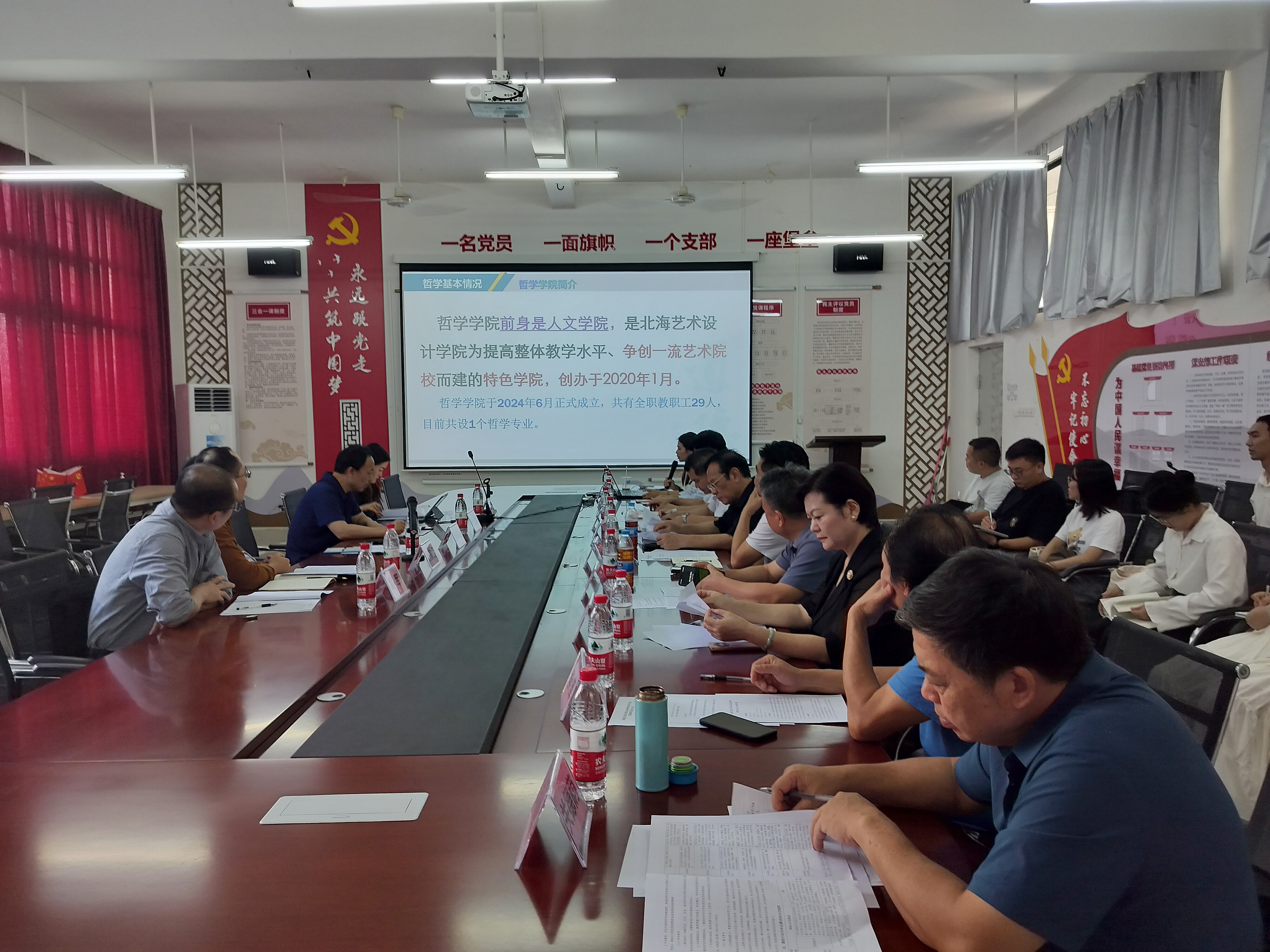 随后,覃传茵副院长向与会嘉宾介绍了我校哲学专业的发展概况。哲学学院是我校开设的非常具有特色的学院,哲学专业在学校的发展中起着基础和引领作用。我校哲学专业积极引进国内优质师资力量,打造高水平教师团队;凭借学校的办学优势和特色,将传统哲学专业课程与特色艺术文化类课程相融合,打造“哲学+艺术”的人才培养特色,用心培养学生的哲学思辨能力和艺术鉴赏能力;坚持以应用型人才培养为导向,采取北海和北京双城育人的培养模式,以精神文化为育人载体,不断吸取北海海洋文化和北京历史文化,达到以文化人的培养目的。目前,我校哲学专业毕业生就业方向多元,发展前景广阔。