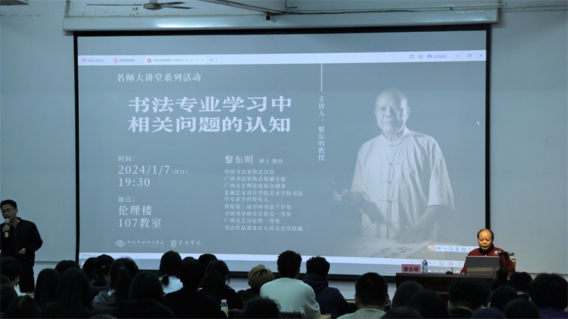1月7日晚,我校美术学院黎东明教授于西校区伦理楼107开展题为《书法专业学习中相关问题的认知》的精彩讲座。讲座由书法学教研室主任苏乃从主持,美术学院2022、2023 级书法学专业师生参加讲座。