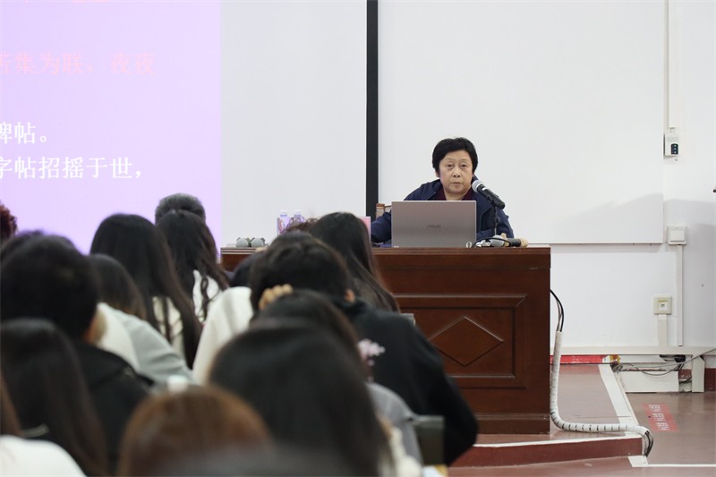 唐光华介绍了书法艺术的悠久历史和丰富内涵,强调了书法作为中国传统文化的重要组成部分,其独特的艺术价值和审美意义。她还通过书法艺术作品展示,以直观方式提升现场学子审美情趣,并激发同学们对中华优秀传统文化的学习热情。