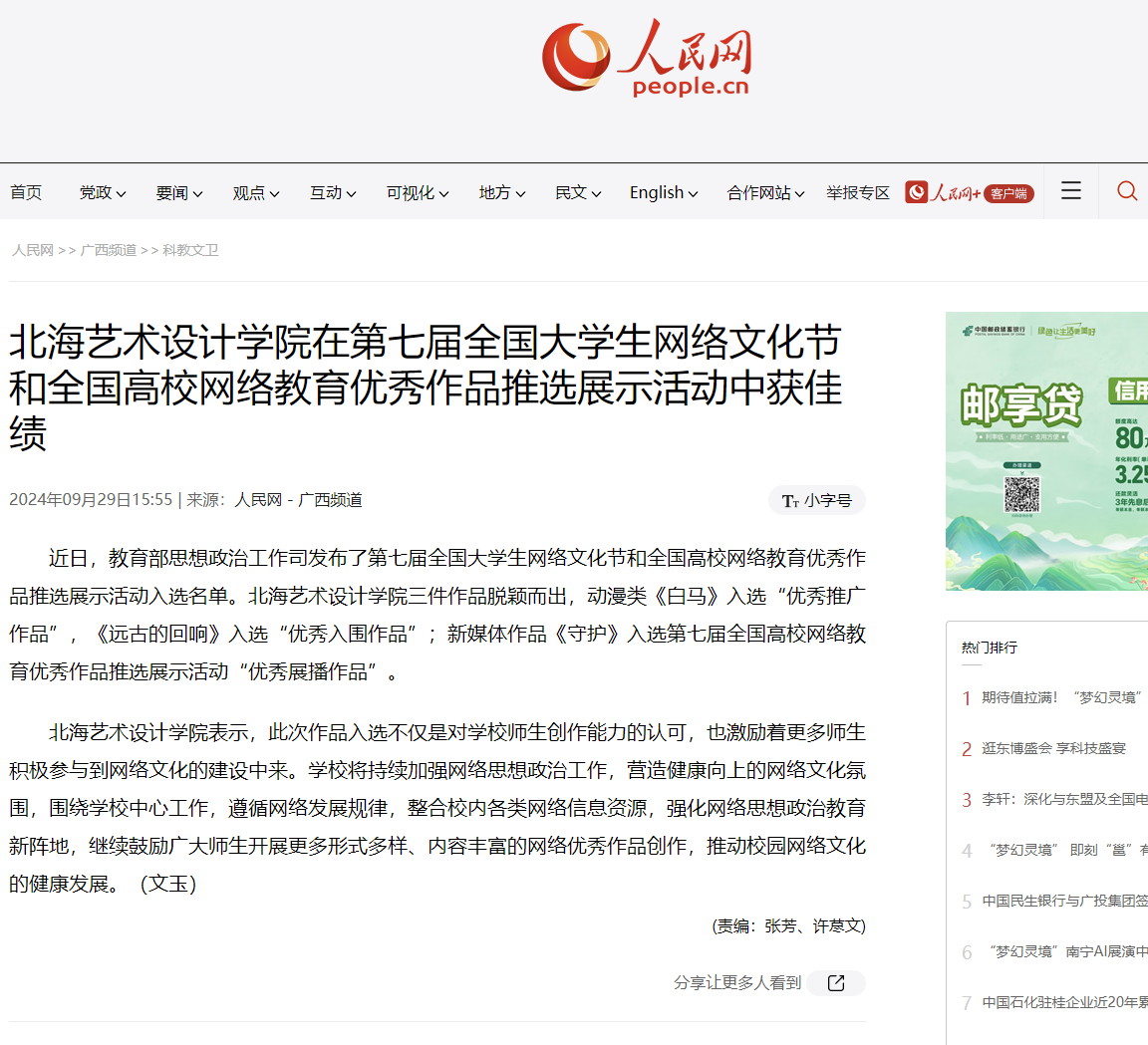 人民网:北海艺术设计学院在第七届全国大学生网络文化节和全国高校网络教育优秀作品推选展示活动中获佳绩