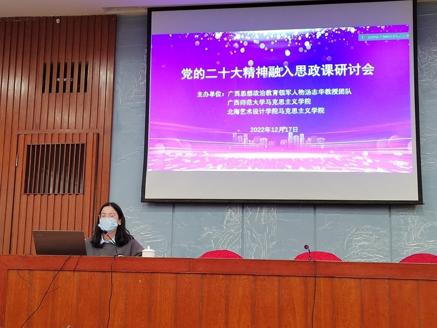 在研讨会上,中央马工程首席专家郑传芳教授、教育部思政课教指委委员汤志华教授、集美大学李晋玲教授、广西师范大学孟宪平教授、北海艺术设计学院马克思主义学院姜献生教授分别作了主题报告,为线上线下的参会人员带来了一场学术盛宴。