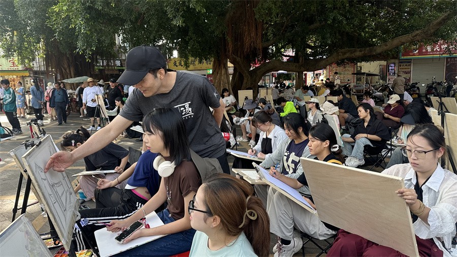 各专业教授和任课老师也纷纷深入实践活动,开展主题授课,对学生作品进行讲解指导,对学生创作过程中的疑难问题认真解答,给予学生新的创作视角和创作思维。每日外出实践写生后,专业教授和指导老师还会与学生一同进行交流学习,对当天的创作作品进行集中点评,指出作品存在的不足与优点。学生听取教授和指导老师的意见和建议,不断总结改进,加强专业知识理论和实践融合,为今后的学习和采风写生实践积累了更多经验。
