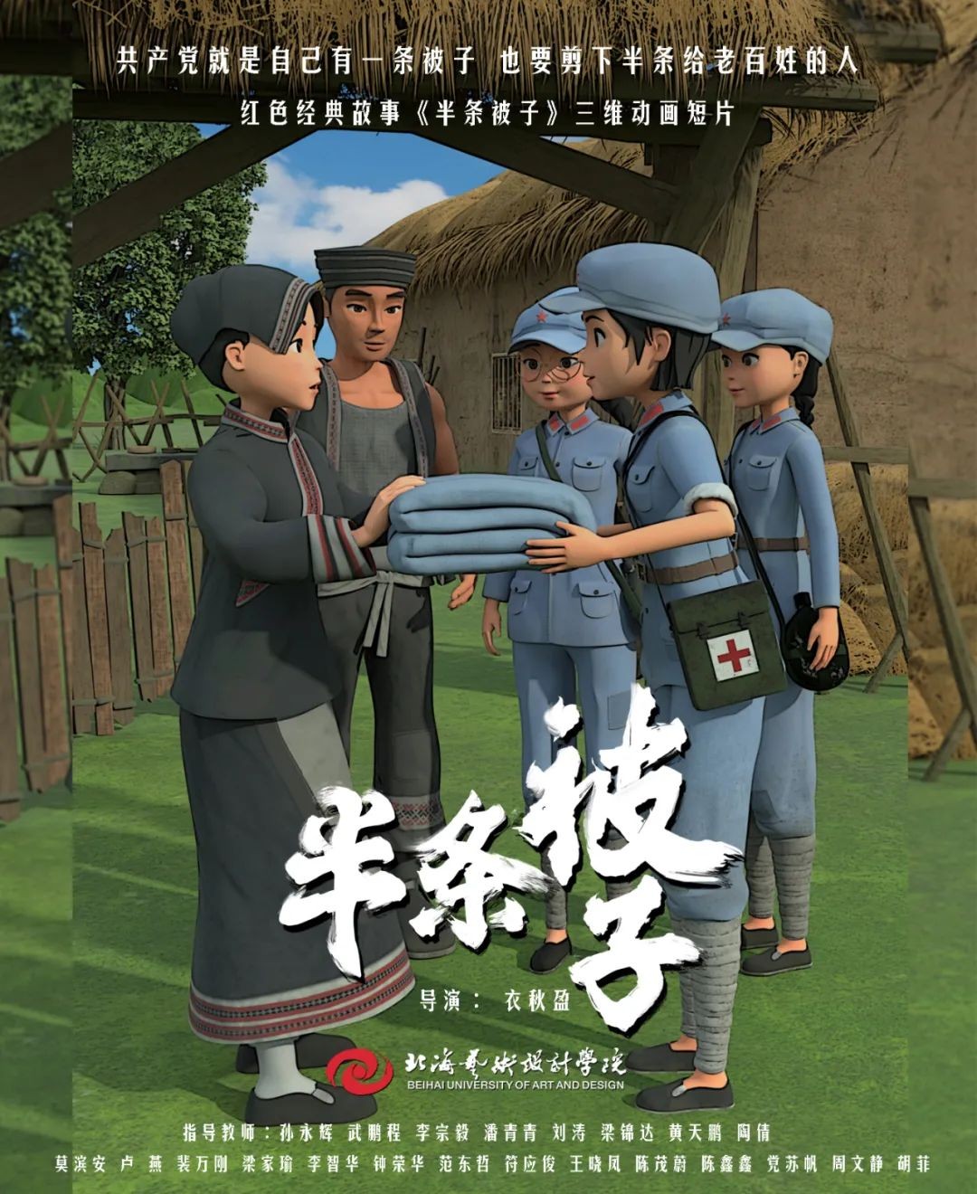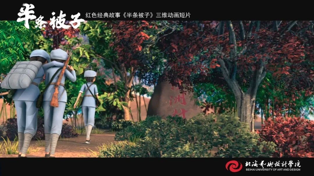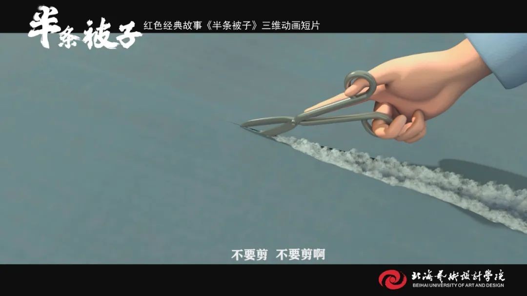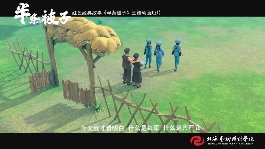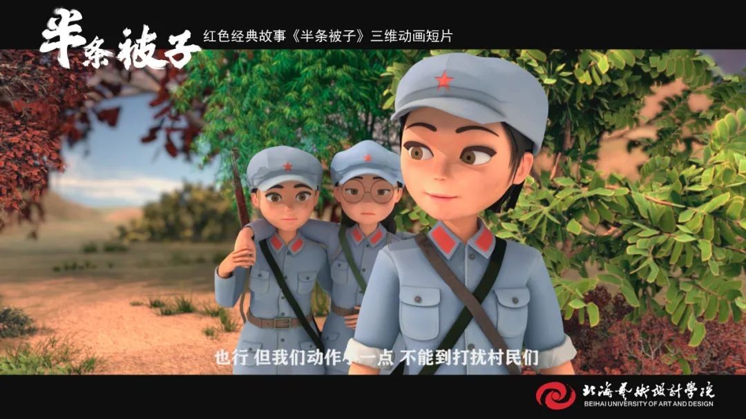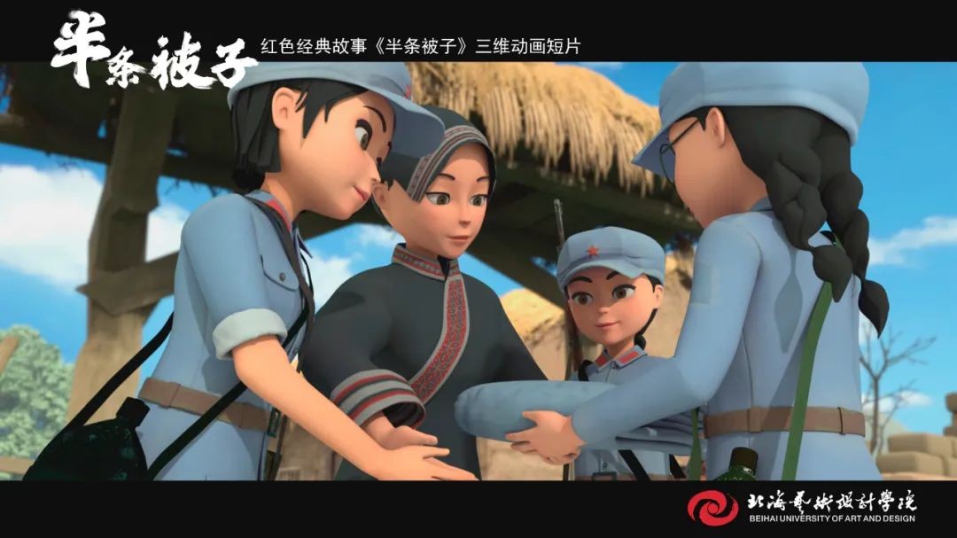 《半条被子》是我校动画与传媒学院18级在校学生在“建党百年”命题下制作的动画短片作品,取材于纪念红军长征胜利80周年大会上,习近平总书记讲述了82年前发生在湖南汝城县的“半条被子”的感人故事。3名女红军借宿在湖南汝城县沙洲村村民徐解秀家临走时,将自己仅有的一床被子剪下一半送给老人。什么是共产党?共产党就是自己有一条被子,也要剪下半条给老百姓的人。