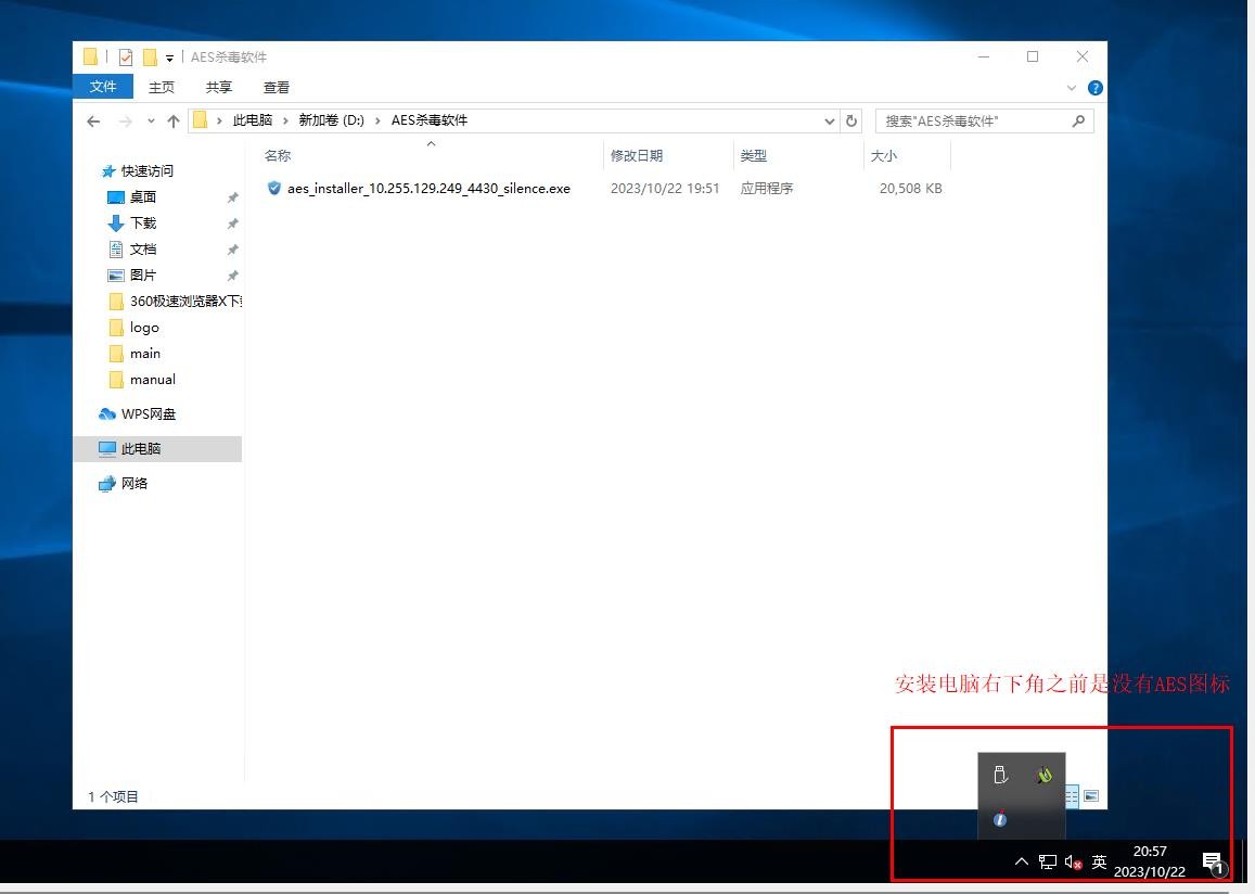 2.双击“aes_installer_10.255.129.249_4430_silence”运行安装,然后等待静默安装,直到电脑右下角出现AES的软件图标说明安装完毕,不同电脑安装时间不同,大概几分钟到十几分钟。