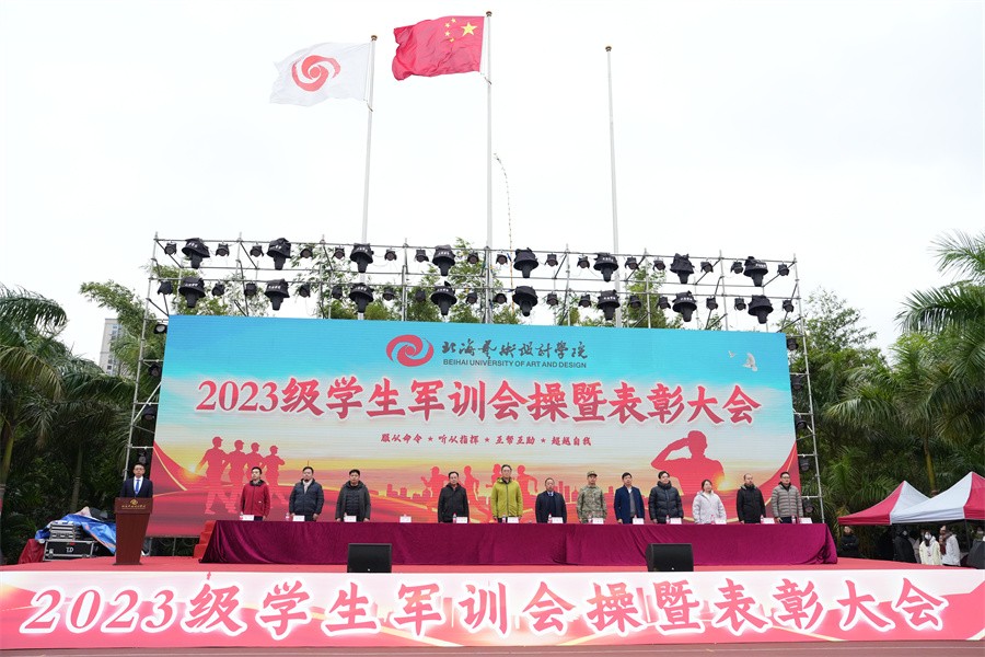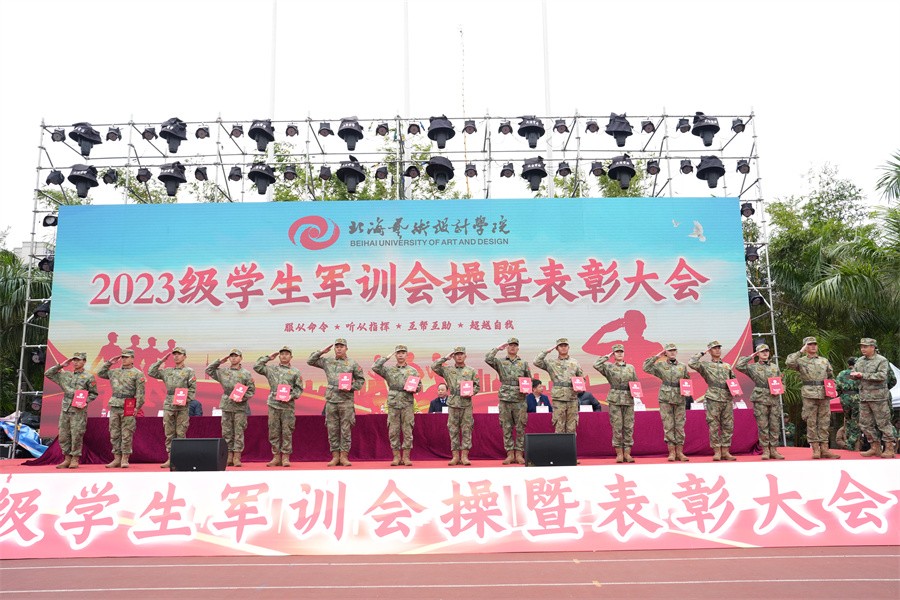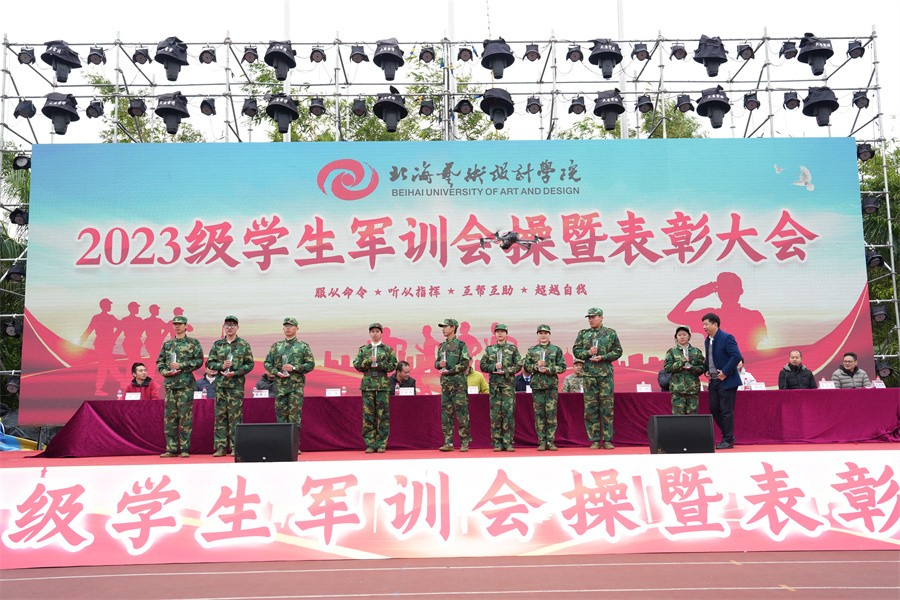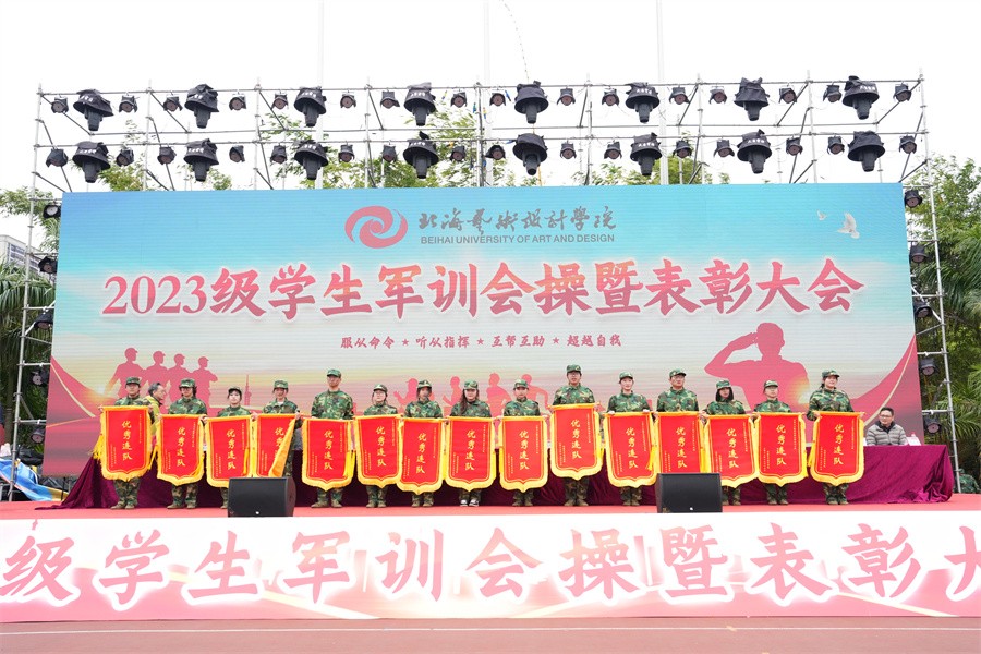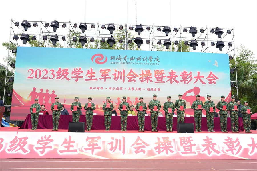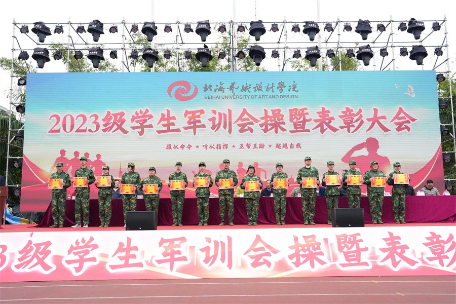 大会上,党委书记范徽忠宣读了《北海艺术设计学院关于表彰2023级学生军训“优秀标兵”“优秀内务寝室”“优秀教官”和“优秀连队”的决定》,向军训中的优秀个人、先进集体和在军训期间合唱比赛中获奖的连队进行表彰,并由现场领导依次颁发荣誉证书和锦旗。