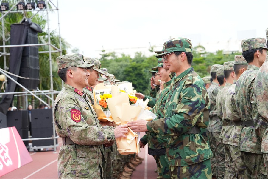 十四日挑战,十四日陪伴。会操大会的最后,各连队代表向全体承训教官献花,为他们的辛勤付出表示感谢。(周小琪、郭松、大学生记者团/摄)