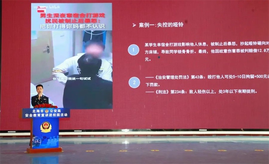 在法治教育宣传环节,市公安局多警种联动,围绕校园安全开展专题宣讲。交警支队民警结合典型案例揭示超速行驶、酒驾醉驾的危害,呼吁全体师生“青春不‘飙’车 安全向未来”。治安支队民警以校园暴力为切入点,深入剖析典型案例,传授自我保护技巧。新网侦支队民警聚焦网络安全,揭露在学生身上常见的刷单返利类诈骗、网络游戏产品虚假交易等诈骗手段,引导学生识别网络风险,筑牢“网络防火墙”。禁毒讲师、银海分局民警结合涉毒案例,详细讲解了毒品的危害及新型毒品“依托咪酯”的风险,增强青少年禁毒意识,并倡导青少年坚决对毒品说“不”。