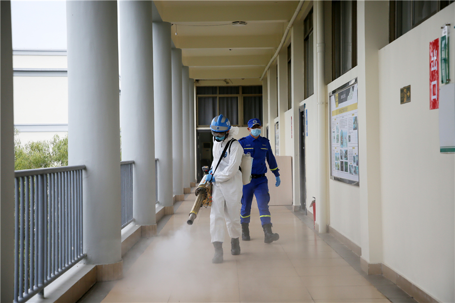 4月20至23日,学校组织全校教职员工对学校办公楼、教学楼、宿舍区、图书馆、机房、食堂、超市、办公楼、隔离室、医务室、校园绿化带等重点区域进行全面卫生清洁。各部门根据任务区域,各司其职,清除杂物垃圾,清洁污渍尘埃;对教学区进行导引标识和宣传海报粘贴;按照防控标准对教室座位进行调整布置。经过全体教职工的通力合作、不懈努力,校园卫生环境显著提升。