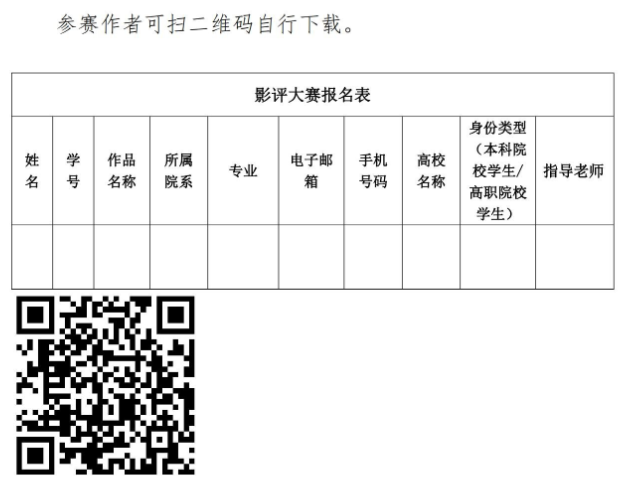 (一)参赛者可从各个院校公告自行下载参赛报名表(附件)并填写,并将电子版作品及报名表一起发送至各校自设的投稿邮箱;影评大赛不接收纸质版作品,所有参赛作品将以投稿邮箱为准。