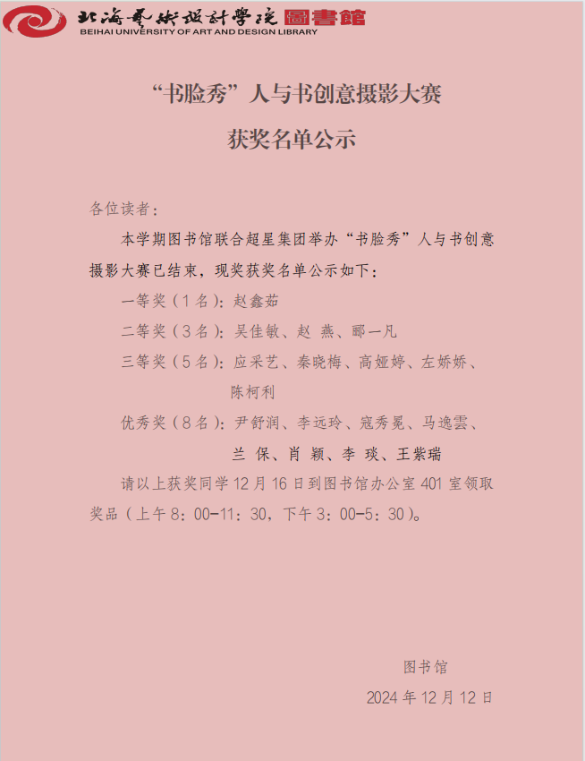 来源:图书馆综合办公室 责编: 陈智滨 作者: 张新玲 发布时间:2024-12-12 浏览量:1339