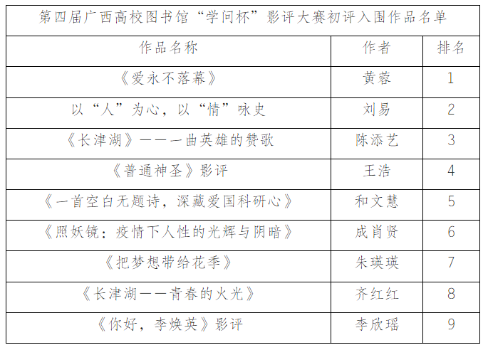 根据《第四届广西高校图书馆“学问杯”影评大赛》的评选要求,图书馆邀请我校四位专家教授对100篇查重合格的作品进行初评,现将初评入围名单公示如下: