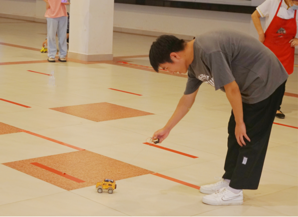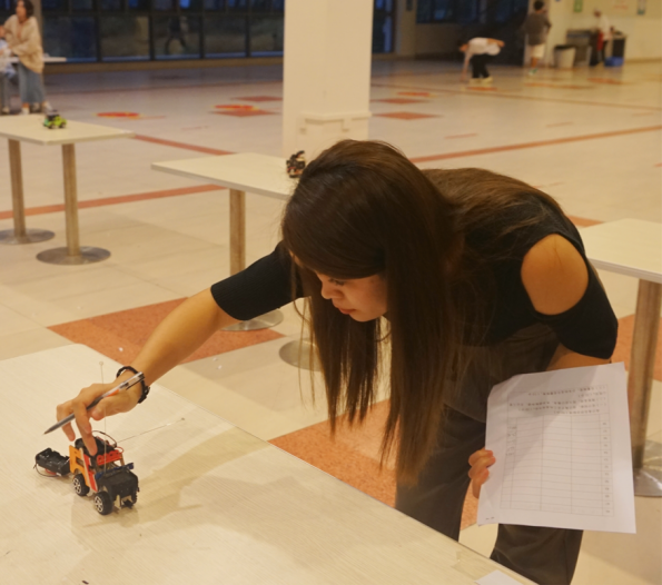 在完成木质小车组装美化赛环节后,选手们由工作人员带领着来到了赛道。每位参赛选手满怀期待的派出他们的“战车”撞击前方的障碍物,将最上方的塑料杯推倒,并遥控小车通过终点,使小车车尾通过终点。比赛进行的十分激烈,现场气氛如火如荼。
