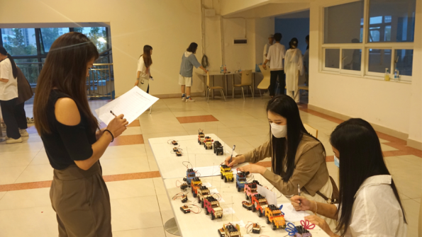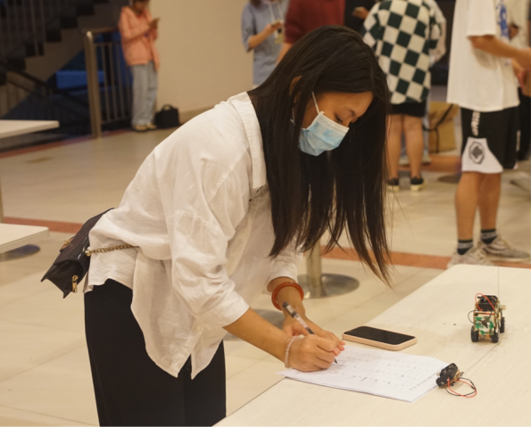 每组比赛完成后都有工作人员对成绩进行测量和统计,每个人的成绩都由统分人一一记录,由评委老师根据小车的美观程度进行打分,活动结束后将记录表统一交到负责人手里。