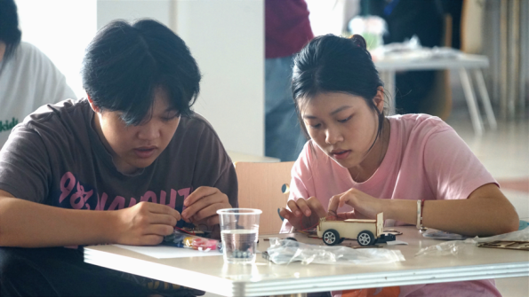 比赛开始,每组参赛选手都有一组木制小车的材料包,选手需在规定时间内(1小时)完成组装。期间需完成小车的组装及美化,时间结束停止组装及美化小车。现场的选手们都在精心制作自己的“战车”,每组都对自己的“战车”信心满满。