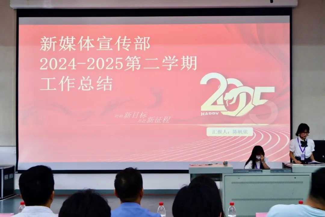 新媒体宣传部负责人陈帆依汇报了本学期工作情况,涵盖工作成果、各部门总结、现存问题及改进措施。新媒体宣传部在本学期发布推文60篇,拍摄活动16次,产出视频3个,制作宣传产品22份,运营的公众号和官网浏览量较上学期有所增长。不过,他们在工作效率、内部沟通和专业能力等方面还存在改进空间,计划通过完善工作流程、加强内部沟通和培训等方式提升整体水平。