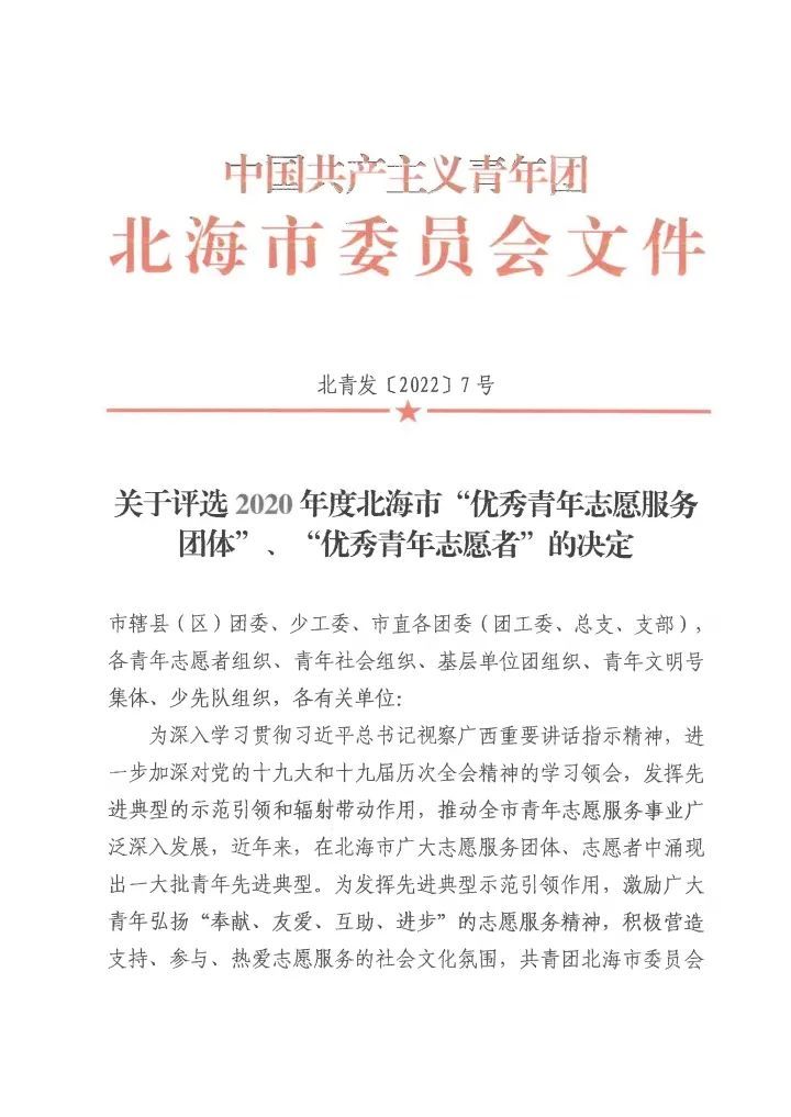 近日,共青团北海市委员会公布“优秀青年志愿服务团体”和“优秀青年志愿者”评选结果,我校团委青年志愿者协会荣获“优秀志愿服务团体”称号,校团委青年志愿者协会会长沈星宇、副会长张敏荣获2020年度“北海市优秀志愿者”称号。
