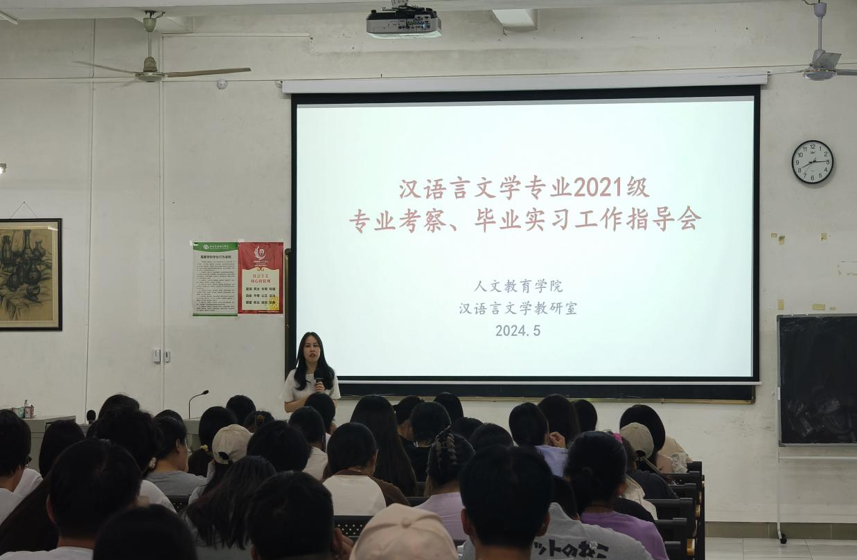 5月24日晚,汉语言文学教研室组织2021级学生在学校东校区觉悟楼106召开2025届汉语言文学专业本科生上京工作专业指导会。会议针对毕业生大四阶段在北京的课程安排、专业考察、毕业实习和毕业论文等各项工作展开详细讲解,帮助学生了解北京期间各项学习、实践任务。人文教育学院副院长梁镨文、汉语言文学教研室副主任姜玮及汉语言文学专业全体教师出席会议。会议由汉语言文学教研室主任蔡森主持。