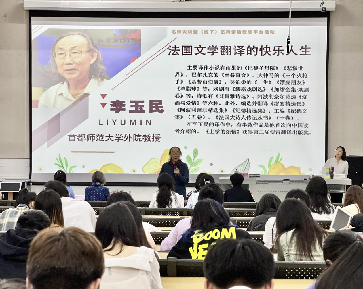 3月22日下午,著名翻译家,首都师范大学李玉民教授于我校西校区公德楼107教室,为广大师生带来了一场题为《法国文学翻译的快乐人生》的精彩讲座。讲座由人文教育学院汉语言文学教研室副主任姜玮主持。