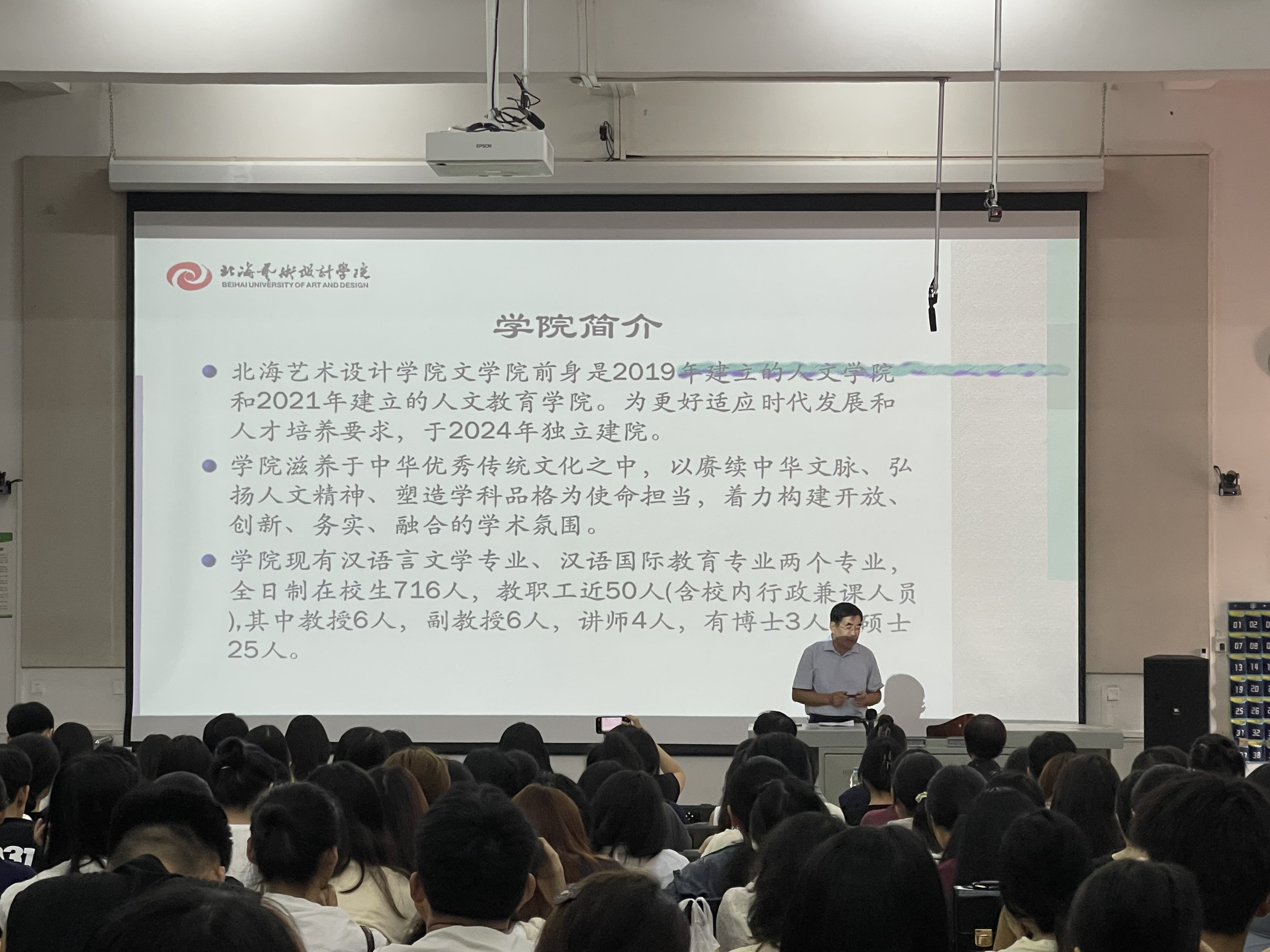 会上,我院院长黄宇鸿教授围绕学院简介、师资队伍建构人才培养方式、专业就业前景等方面展开介绍,为24级新生答疑解惑。黄院长的“开学第一课”不仅帮助24级新生了解了文学院,还增强了学生的专业自信,使学生获得专业认同感与学院归属感。黄教授勉励新生珍惜时间,及时行动,用行动书写梦想,为中华民族伟大复兴做出自己的贡献。