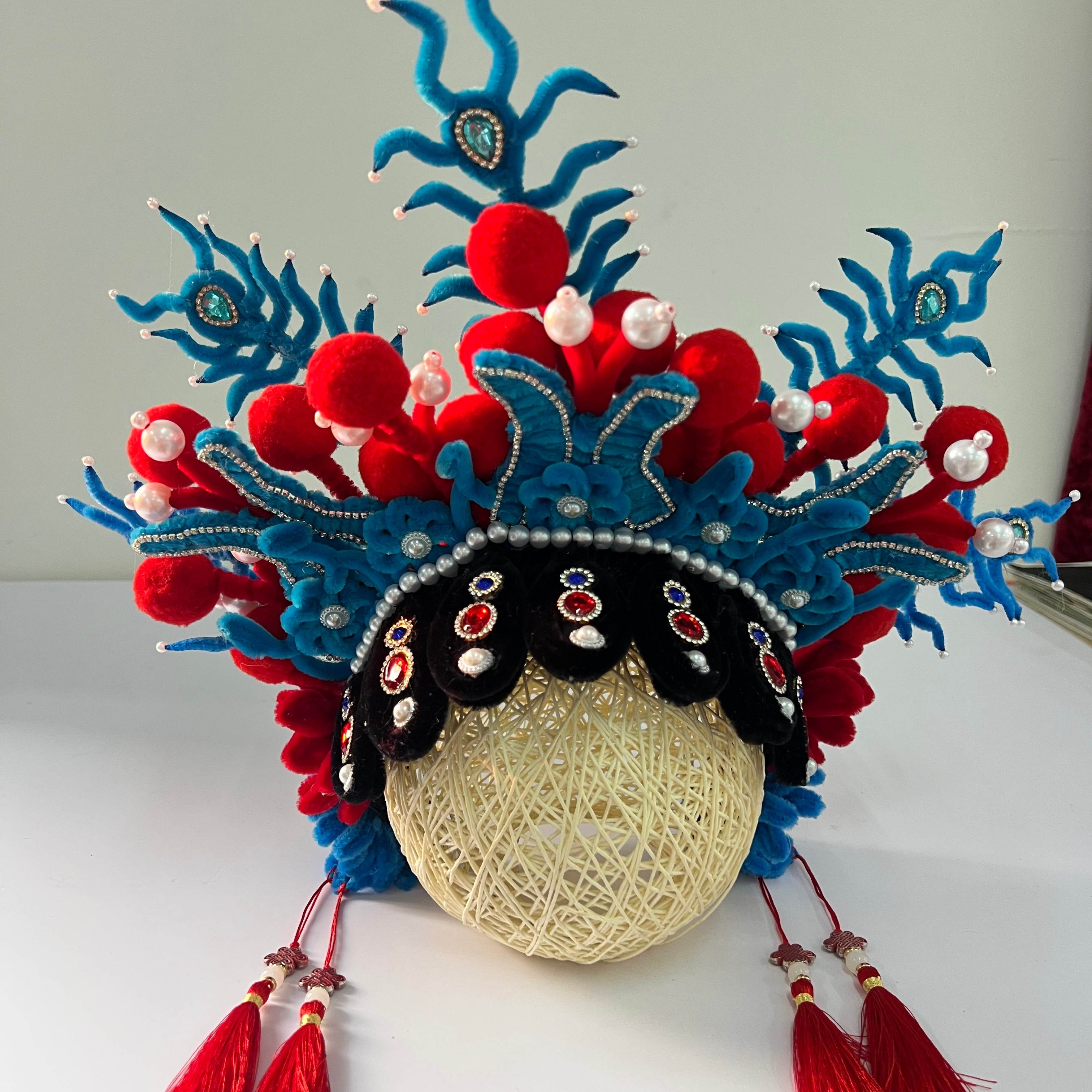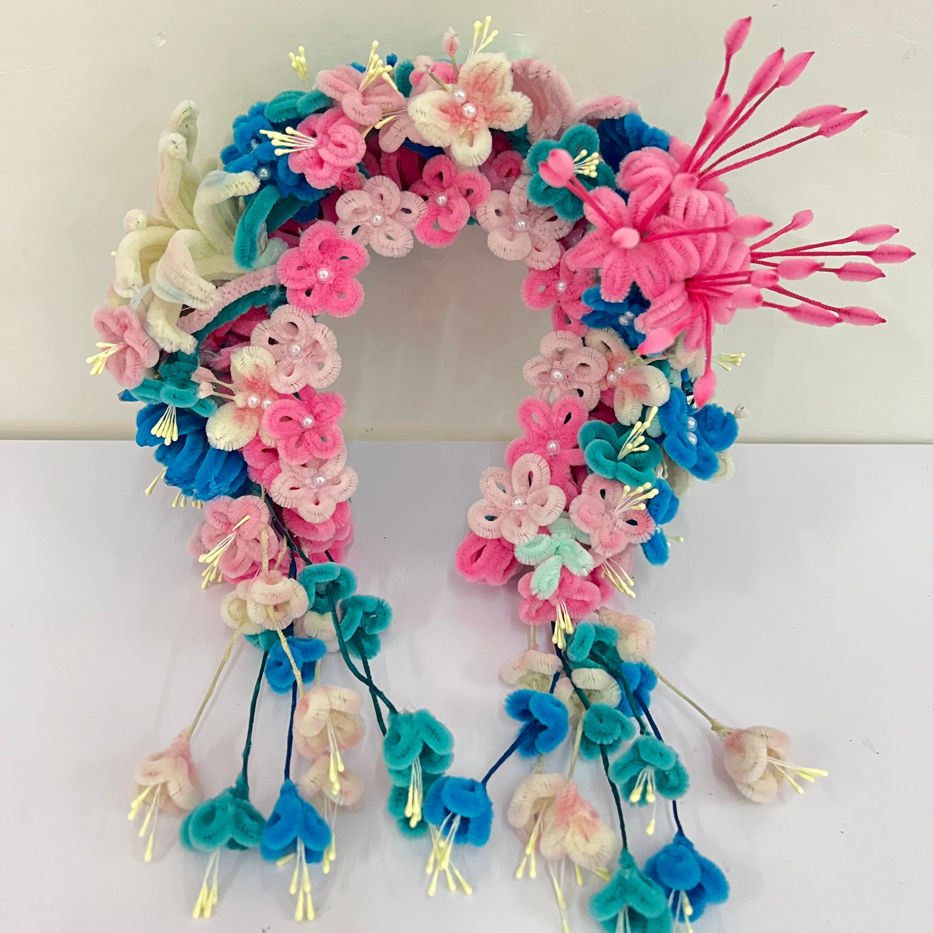 扭扭棒材料的引入旨在保留簪花传统文化的同时,打破传统簪花制作对鲜花材料和技艺要求较高的局限,学生用扭扭棒对簪花的色彩造型进行创新设计,融入现代时尚元素,让古老的簪花焕发出时尚活力。