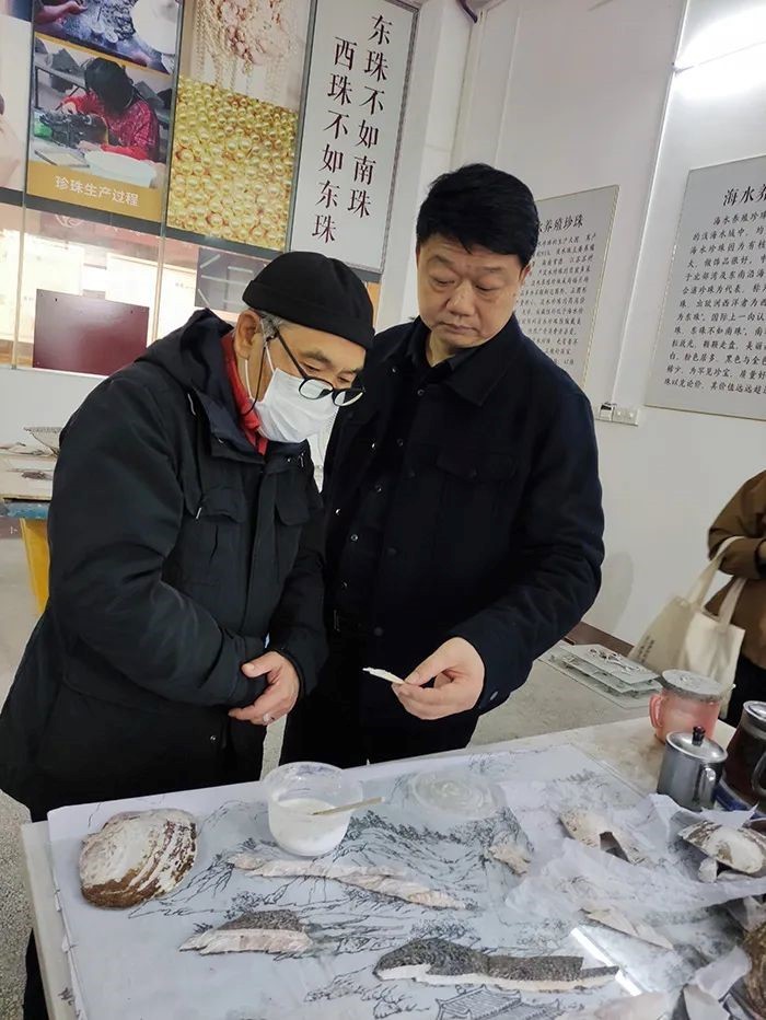 在博物馆参观调研时,王教授认真听取林雄对北海贝雕近十年的发展历程的介绍,王教授对博物馆内的藏品很感兴趣,仔细了解藏品的来历的同时,对藏品保护提出了宝贵意见,对贝雕工艺巧夺天工的自然之美,赞不绝口。