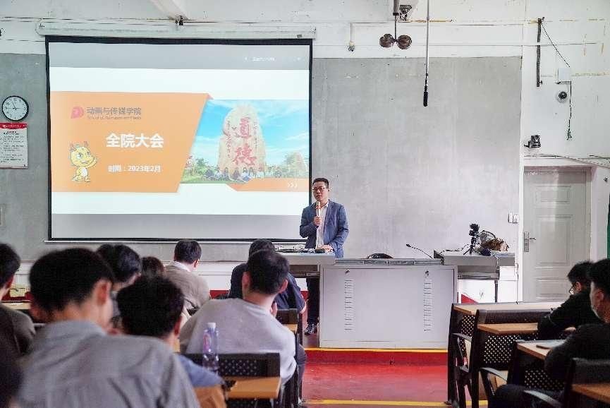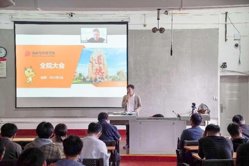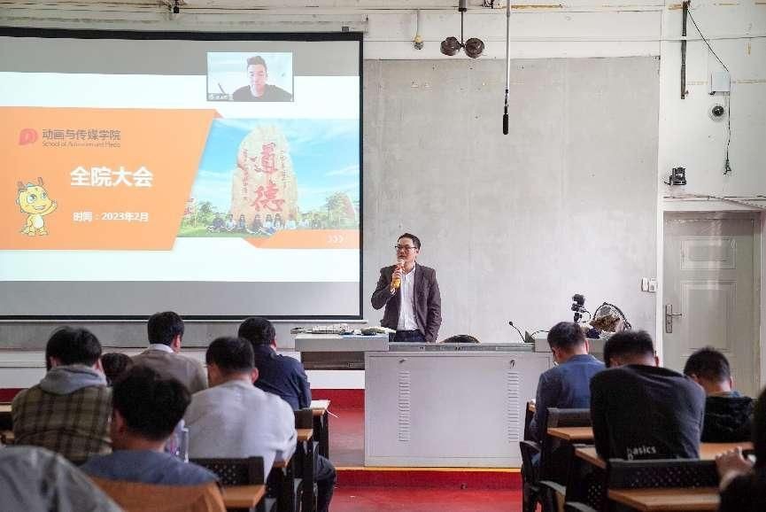 律回春晖渐,万象始更新。为贯彻落实学校“十四五”发展规划,进一步提升学院办学质量,强化学校常规管理,明确本学期总体工作方向,部署迎评安排,更好地开展新学期各项工作,2023年2月12日上午,北海艺术设计学院动画与传媒学院在东校区觉悟楼104室召开了新学期的全院大会。学院党总支书记庞定坤、院长孙永辉、党总支副书记黄强红、副院长杜博、刘涛等领导及全院教师出席会议,会议由综合办主任邱红叶主持。