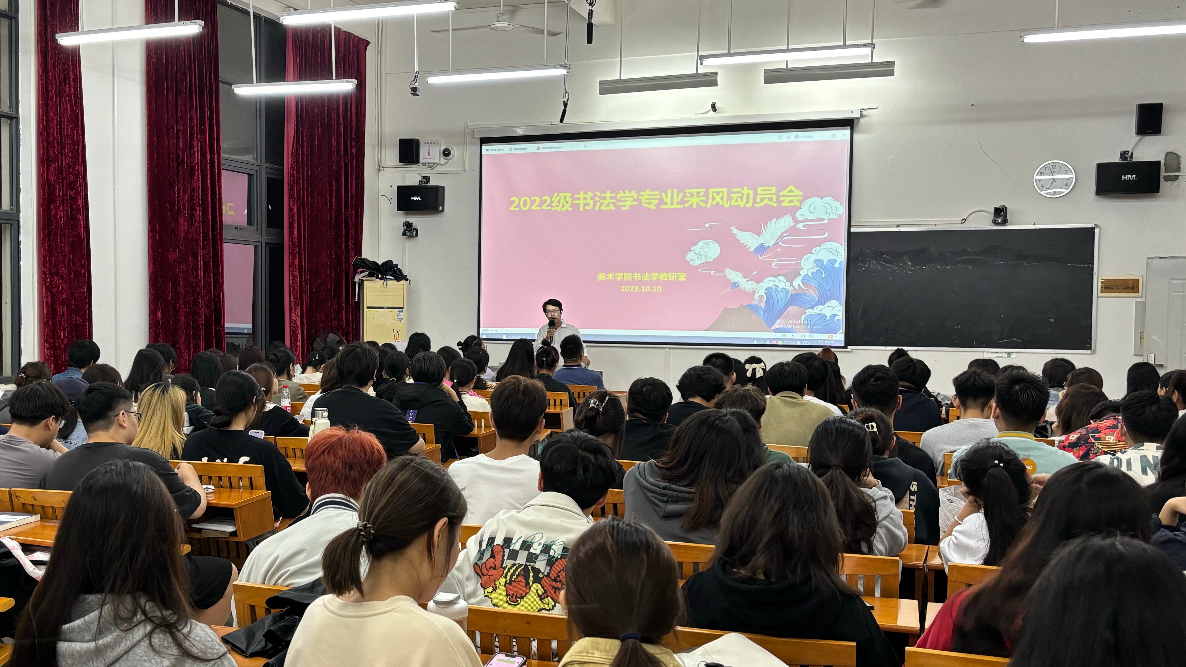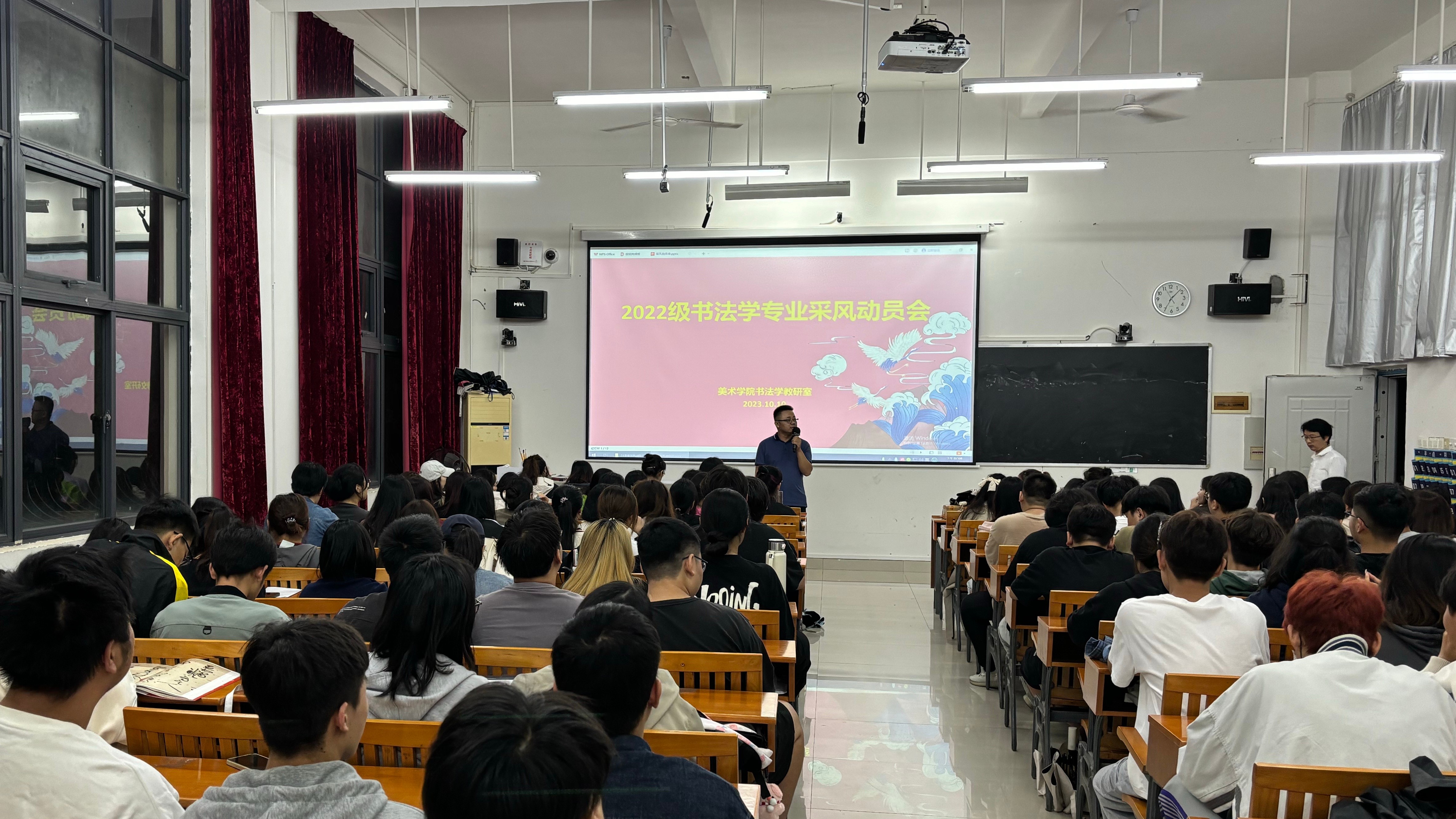 20231010日晚,美术学院书法学教研室针对《专业采风》课程为2022级书法学专业全体同学开展课程相关介绍暨采风动员会。美术学院院长龚为出席,书法学教研室主任苏乃从主持,全体任课教师及班主任参会。
