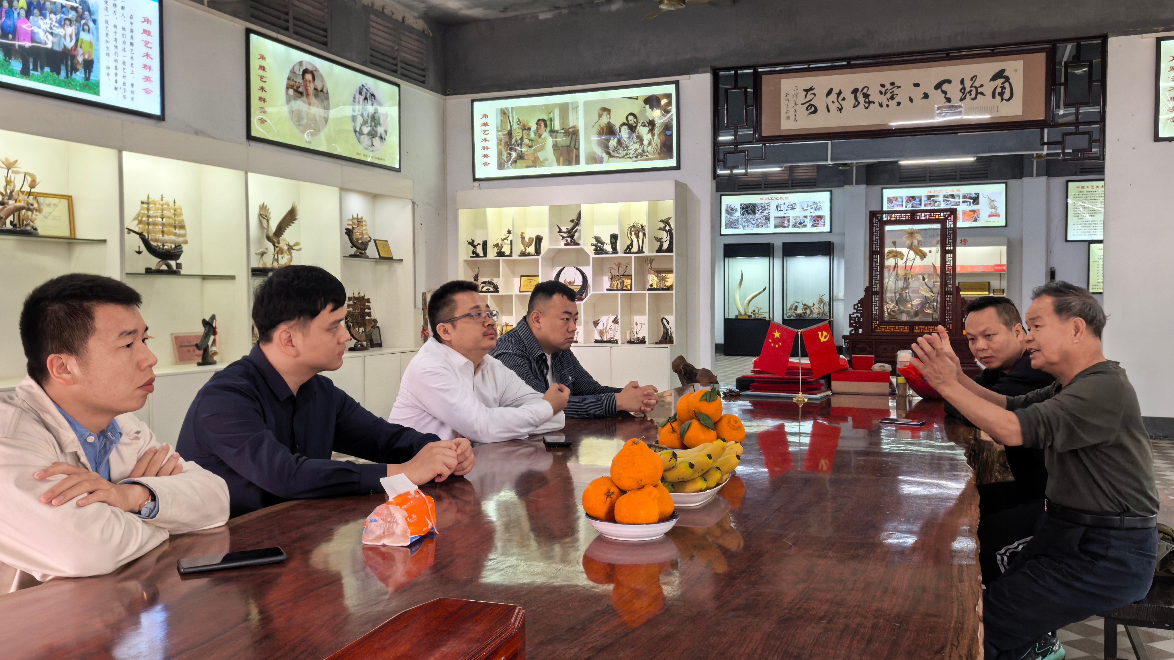 上午930分,学院一行首先抵达合浦金蝠角雕有限责任公司。作为传统工艺的杰出代表,角雕艺术在这里焕发出独特魅力。学院领导与企业负责人就合作事宜展开深入交流,不仅提及鼓励学院师生参与广西工艺美术大赛,企业负责人有望担任评委,为大赛注入专业力量,还针对雕塑课程教学达成共识。学院计划安排相关课程,带领学生亲身体验角雕艺术,深入了解角雕材料及简单技法,并指导学生创作作品参赛,从大学一年级开始,将雕塑专业学生分批培养,设定主题作业,按照比赛要求进行系统培训,共同推动非遗创作的传承与创新。企业方面也分享了大师带领师生获奖的经验,双方期待通过紧密合作,实现共同目标。