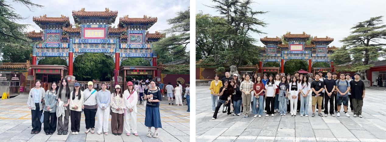 雍和宫的庄严典雅、孔庙和国子监的文脉悠长,成为学生们研究传统建筑的“活教材”。师生团队以“轴线・秩序・文化”为调研线索,实地丈量中轴对称的空间布局、梳理院落层次的递进关系、记录装饰语汇的符号寓意,细致观察传统建筑中材质色彩与景观环境的呼应细节。学生们从设计手法与文化象征双重维度,探索传统空间语言的现代转译路径,为将传统文化元素融入当代环境设计寻找突破口。