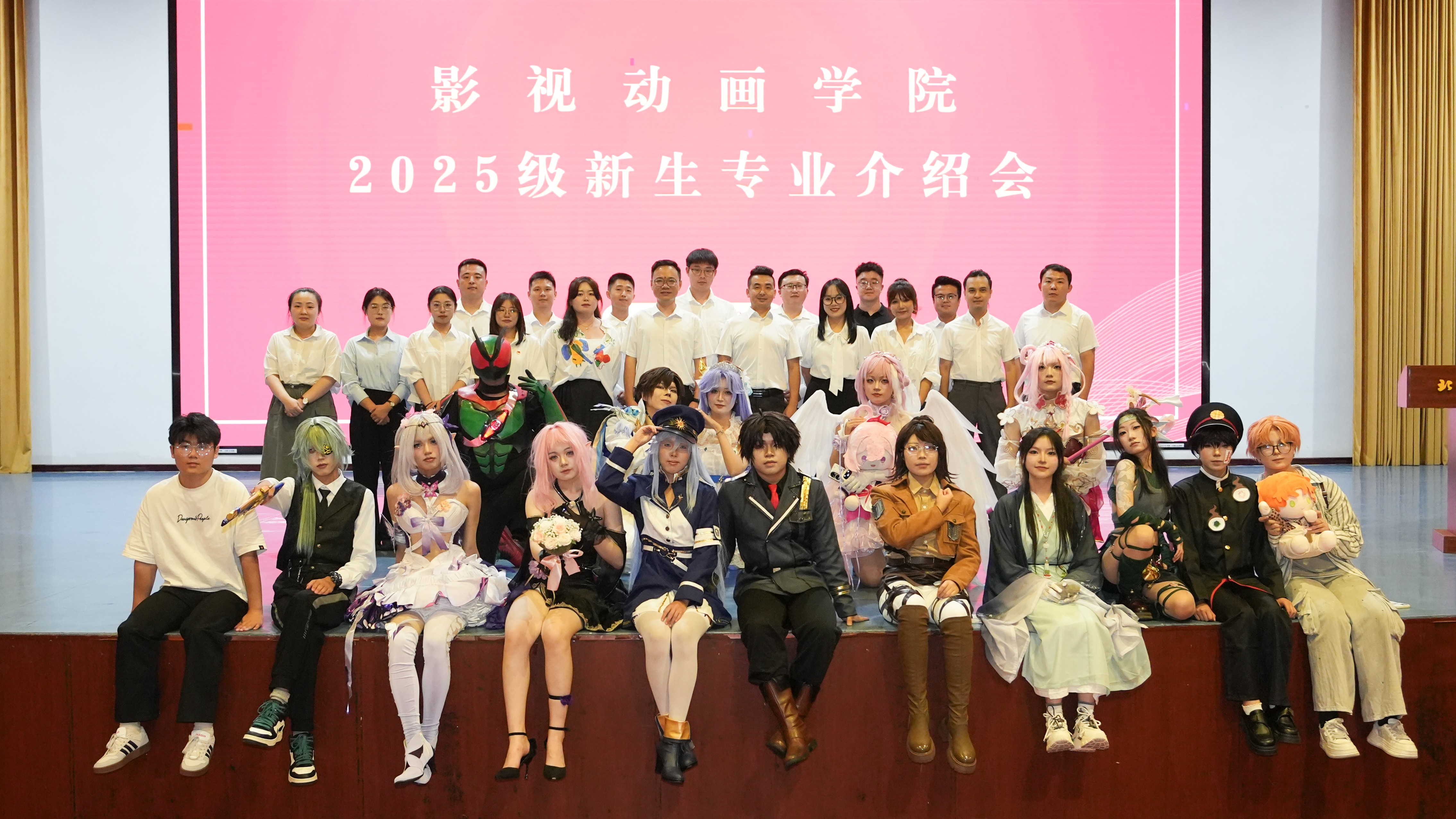 专业介绍会以学院宣传片开场,向新生们展现影视动画学院的发展历程、师资设备、教学特色、师生优秀作品及学院历年来取得的成果。随后,学院分团委学生的Cosplay表演点燃现场气氛,表演尾声,2025级全体辅导员携学院吉祥物“阿布”亮相,拉开专业介绍会的序幕。