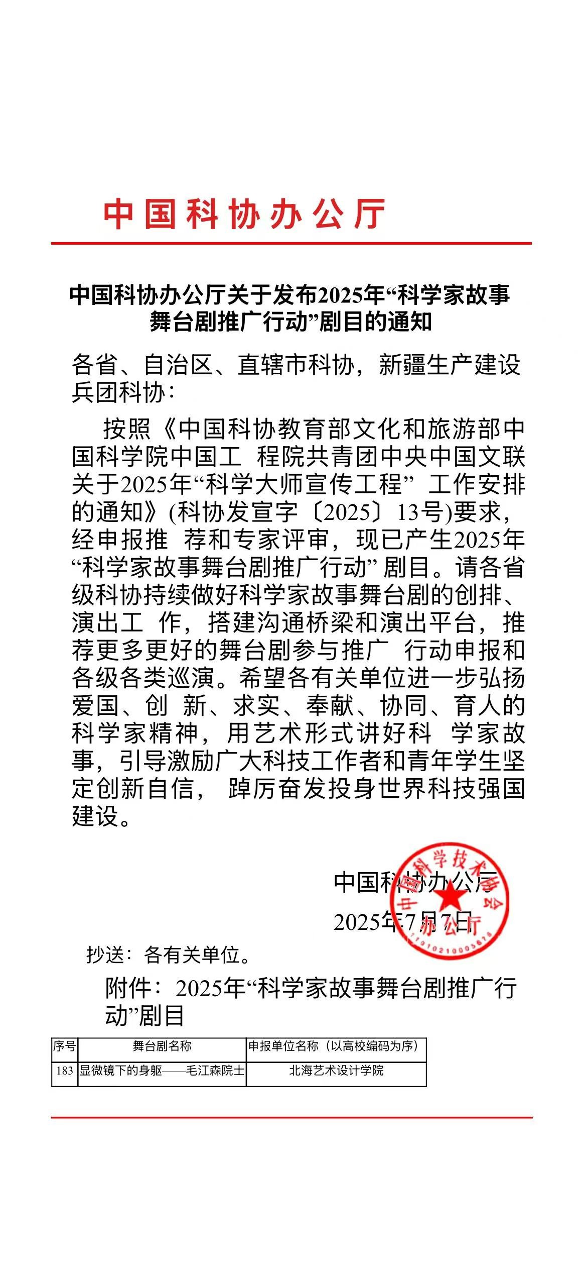 当舞台光影掠过岁月长河,当青春演绎触碰科学星辰,2025年“科学家故事舞台剧推广行动”携光而来——传媒艺术学院播音与主持艺术专业原创多幕情景剧《显微镜下的身躯——毛江森院士》成功入选国家级立项名录并获经费支持,以艺术之名向科学精神致敬。