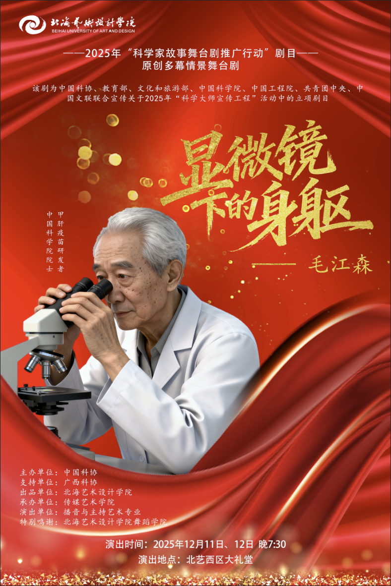 原创多幕情景舞台剧《显微镜下的身躯——毛江森院士》宣传海报