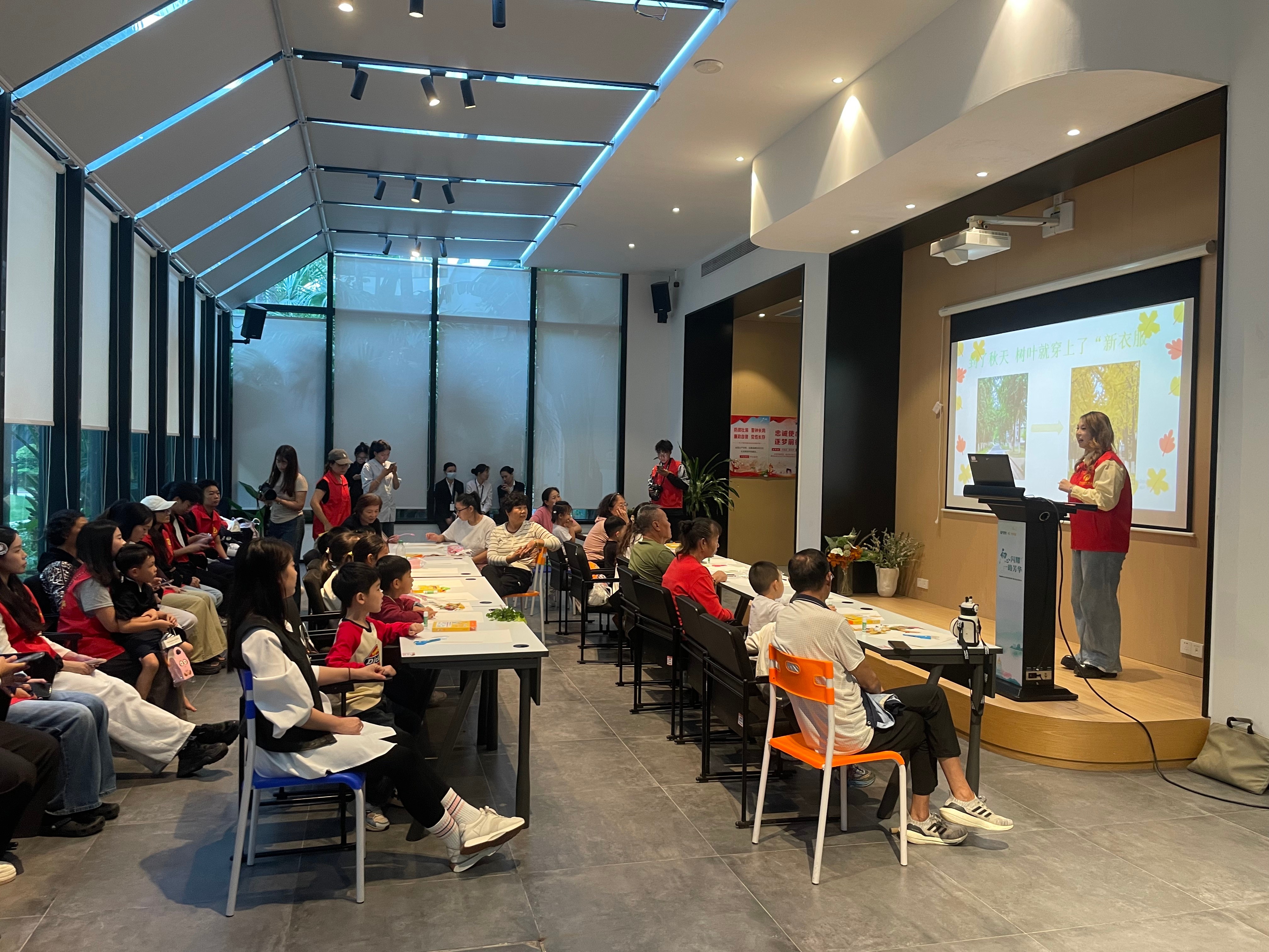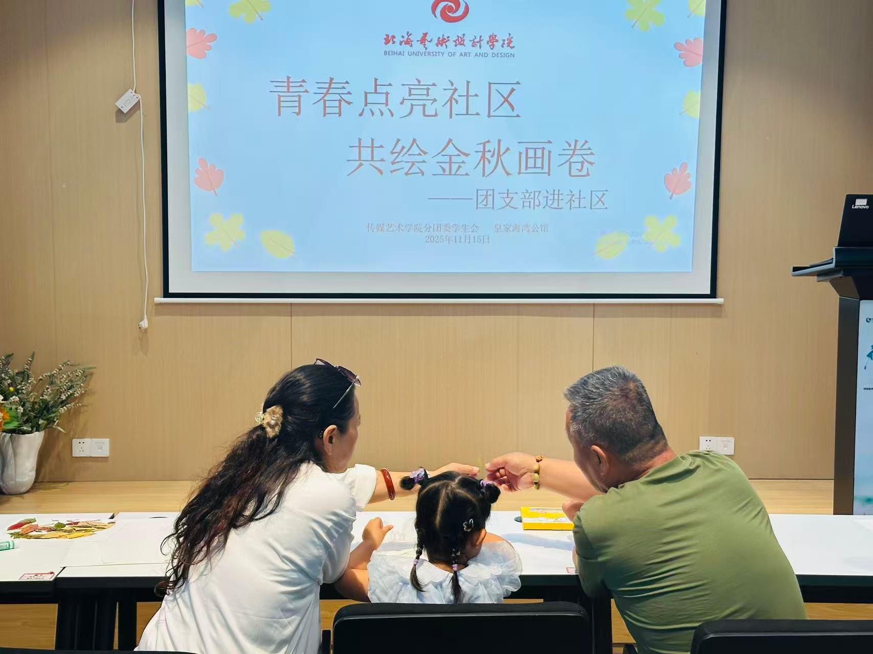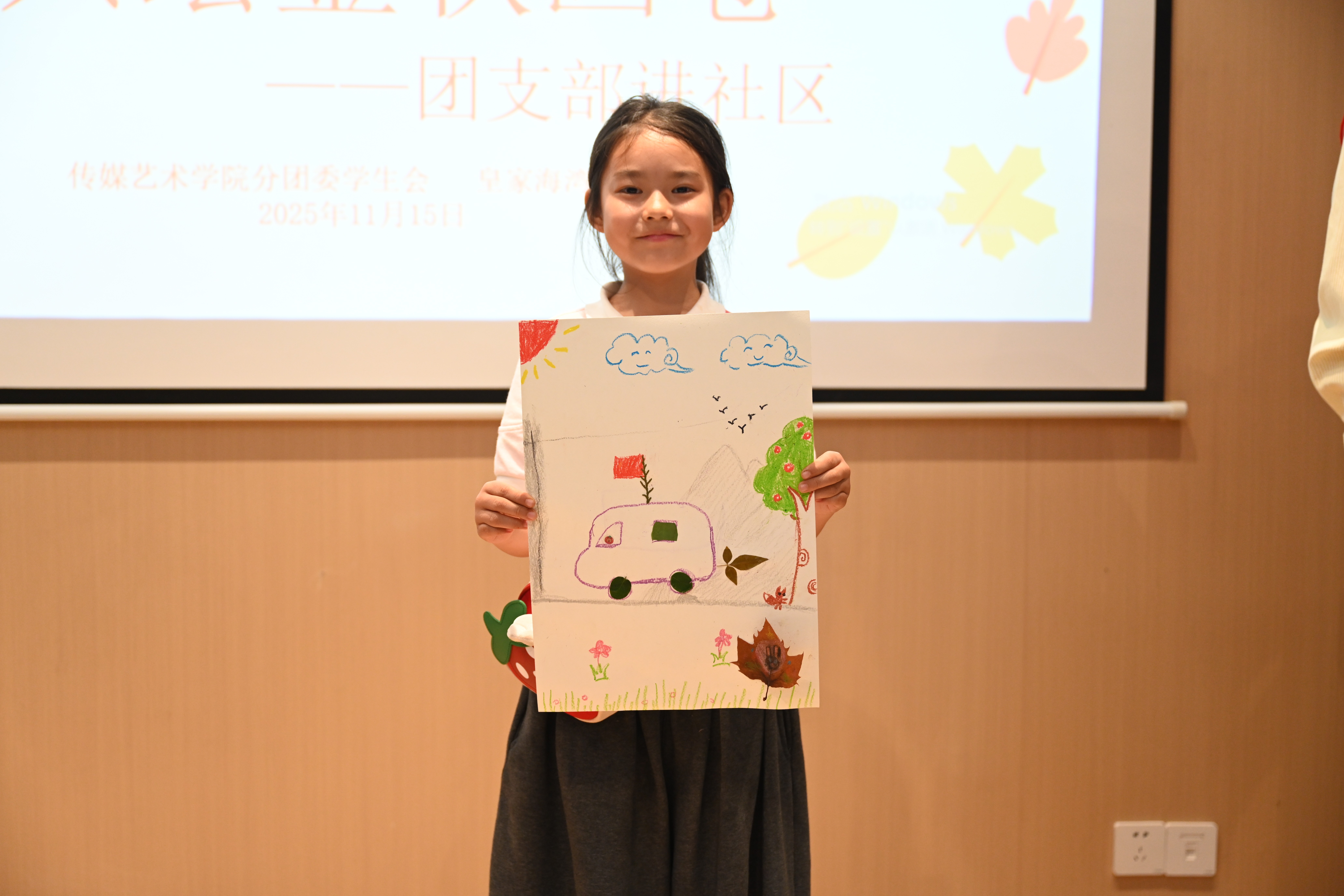 “亲子绘画”环节在社区共享会议室温馨开启。传媒艺术学院的志愿者们充分发挥专业特长,化身“艺术导师”,耐心引导小朋友们展开想象,在洁白的画纸上共同描绘秋天的故事。以“我眼中的秋天”为主题,孩子们在志愿者一对一陪伴下,挥洒童真色彩——金黄的落叶、高远的蓝天、欢笑的家人、嬉戏的身影……一幅幅充满生命力的图景在画笔下渐次绽放。原本静谧的会议室,化作一片流动的色彩海洋,洋溢着童趣与温暖的创作气息。
