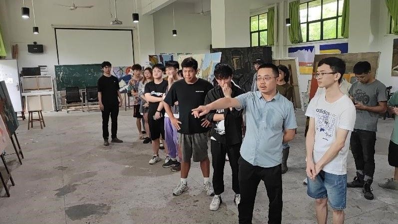 2022年6月9日,2021-2022年度第二学期末,美术学院组织绘画专业19级同学于西校区7栋教学区进行了创作课程的教学成果汇看。本次汇看评审小组由美术学院副院长龚为、美术学院综合办主任肖玺、美术学院综合办副主任陈建江、美术学院实验室主任袁志伟、绘画教研室副主任张湘中以及多位任课教师组成。各位老师对学生的作品进行了集体观摩并提出指导建议,对于即将离校的学生给予了相关事宜的嘱咐和未来学习生活上的鼓励。(张湘中 摄)