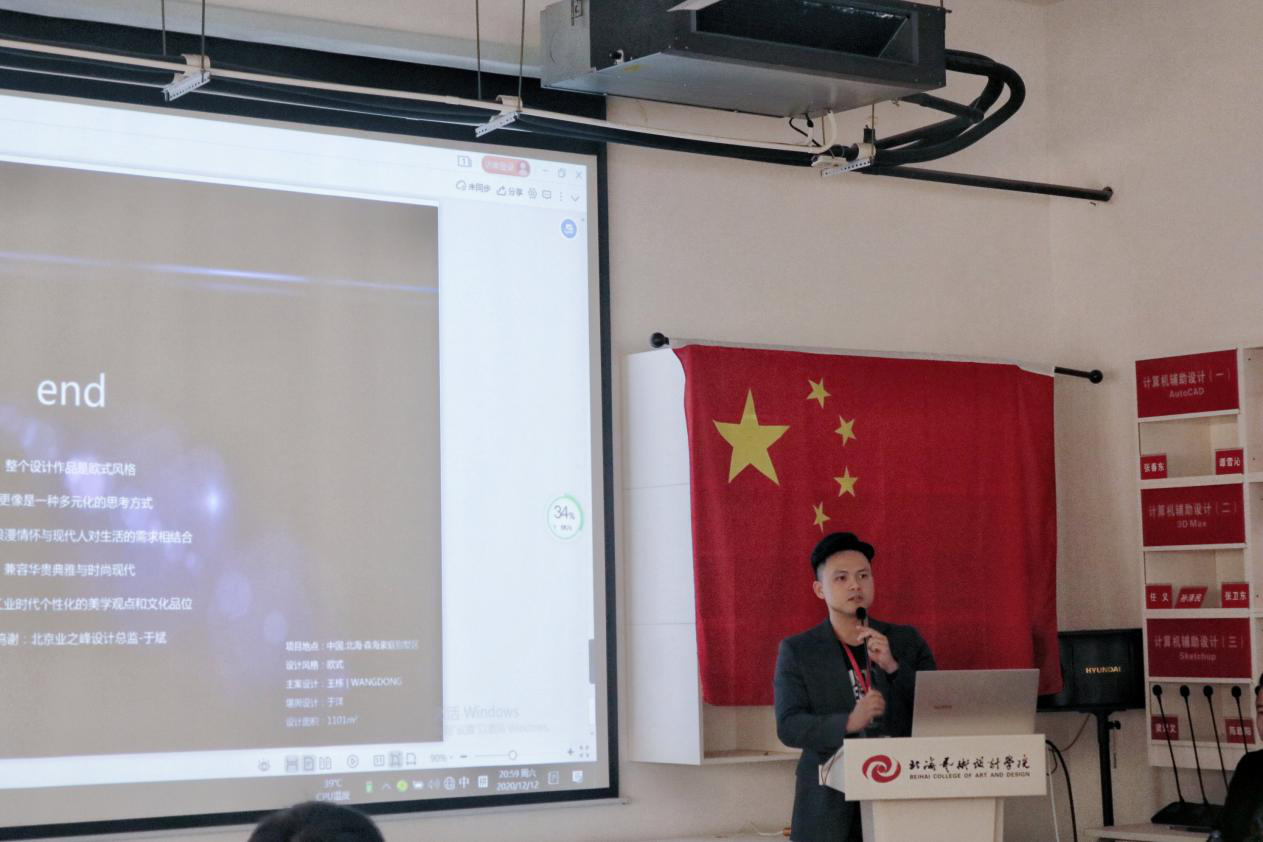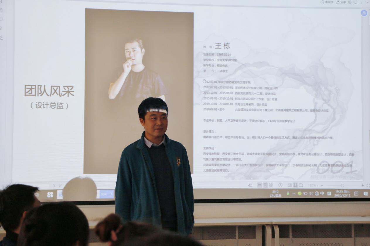 作为本次活动的主讲人,猛鸿装饰设计工程有限公司总监王栋以他“用功能打造艺术,用艺术引导生活。设计和引导人们一个最佳的生活方式,满足人们从物质到精神的需求升华。”的设计理念不断刷新在座老师及同学们的视野。以他丰富的实战设计经验,将《森海50栋别墅》的策划从团队风采到设计方案剖析的层层分明。
