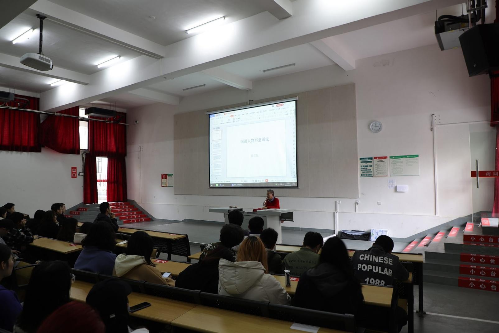 大讲堂开始,崔教授指出中国人物画的发展历史悠久,作为绘画专业的学生需要认真学习历史,读史可明鉴,知古可鉴今,一方面增加个人的文化厚度,另一方面提高个人的审美与学识。中国画的分类较多,从表现方法上分为工笔和写意两大类,从题材上分为人物、山水、花鸟三大类,中国画的工具发展历史悠久,特殊的工具材料使中国画有别于西方绘画。