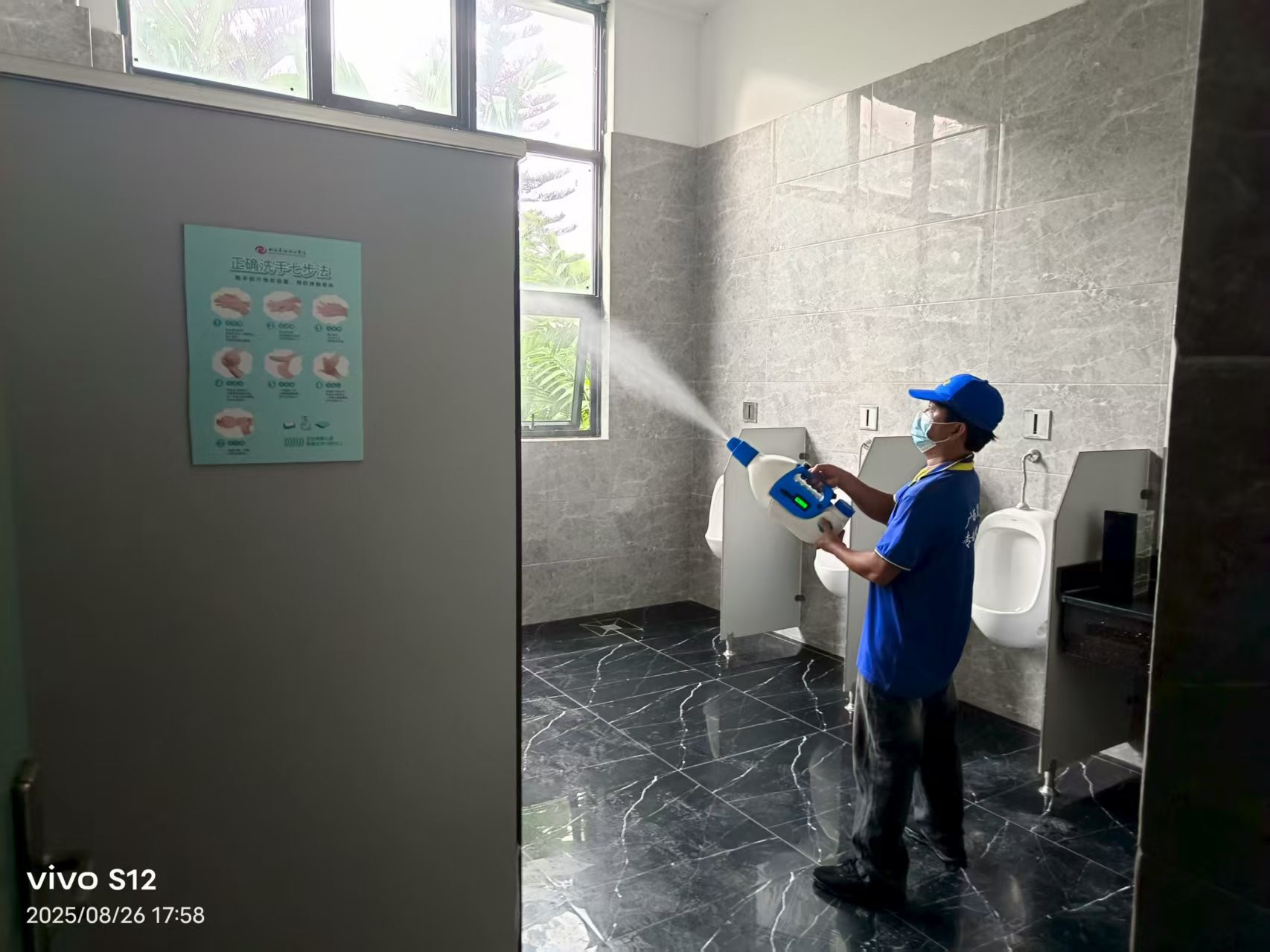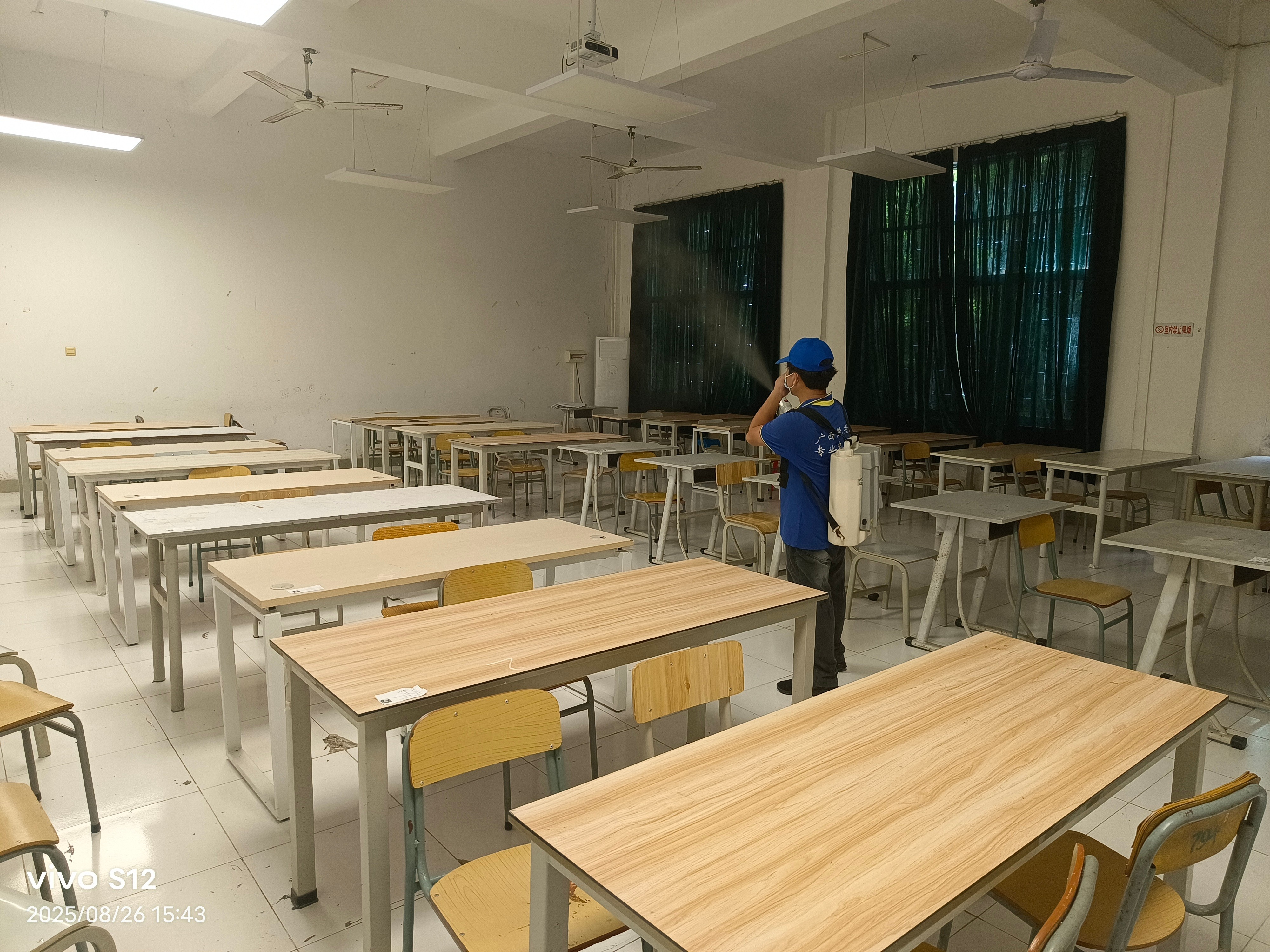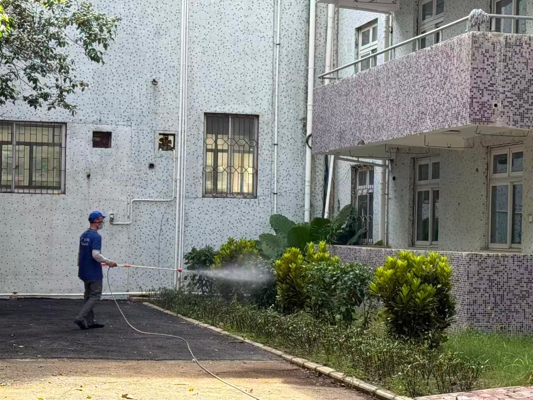 8月26日,我处聘请广西晟冠环境科技有限责任公司采用高压喷洒、成品投放、烟枪热烟喷雾、滞留喷洒等灭蚊方式,对校园办公楼、教学楼、宿舍楼、食堂、厕所、校园绿化带、操场、下水道等易滋生蚊子的场所进行全面消杀,降低蚊虫密度。