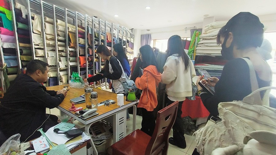 首先由毕业设计指导老师带队前往鑫海商贸城、云裳服饰广场等地开展学习调研,接下来指导学生在园区内进行毕业设计面料的选购、定制。在过程中注意引导学生结合自己服装毕业设计风格进行考察与记录,将所想落实,所见化真,鼓励学生将专业知识与创新实践相结合。