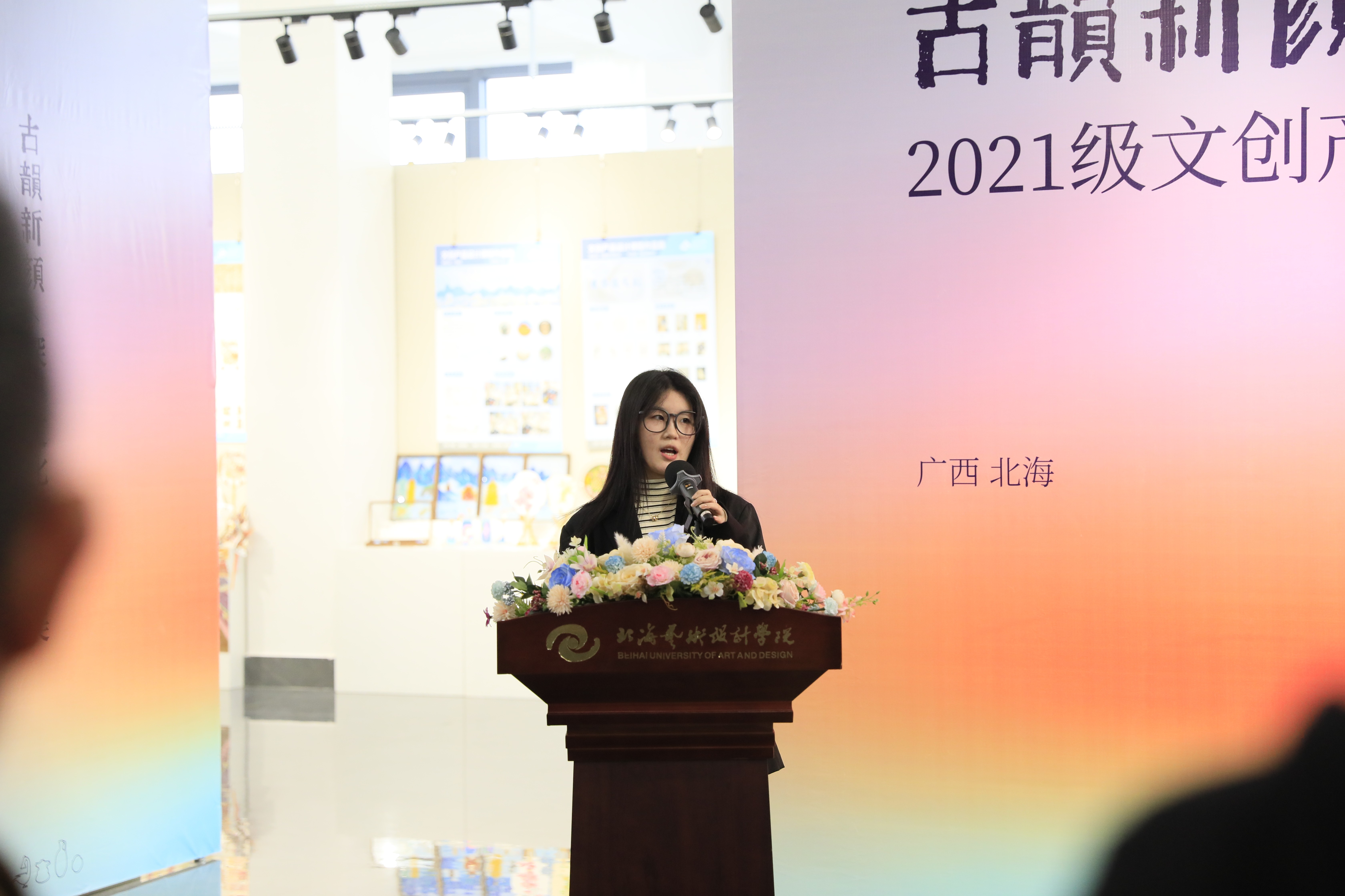 学生代表龙艺萱在发言中表达了同学们对文化传承的热情和对创新的追求,表示未来将不断创新,将传统文化元素与现代生活美学相结合,让文化设计之美更好地服务于社会,造福于人民。