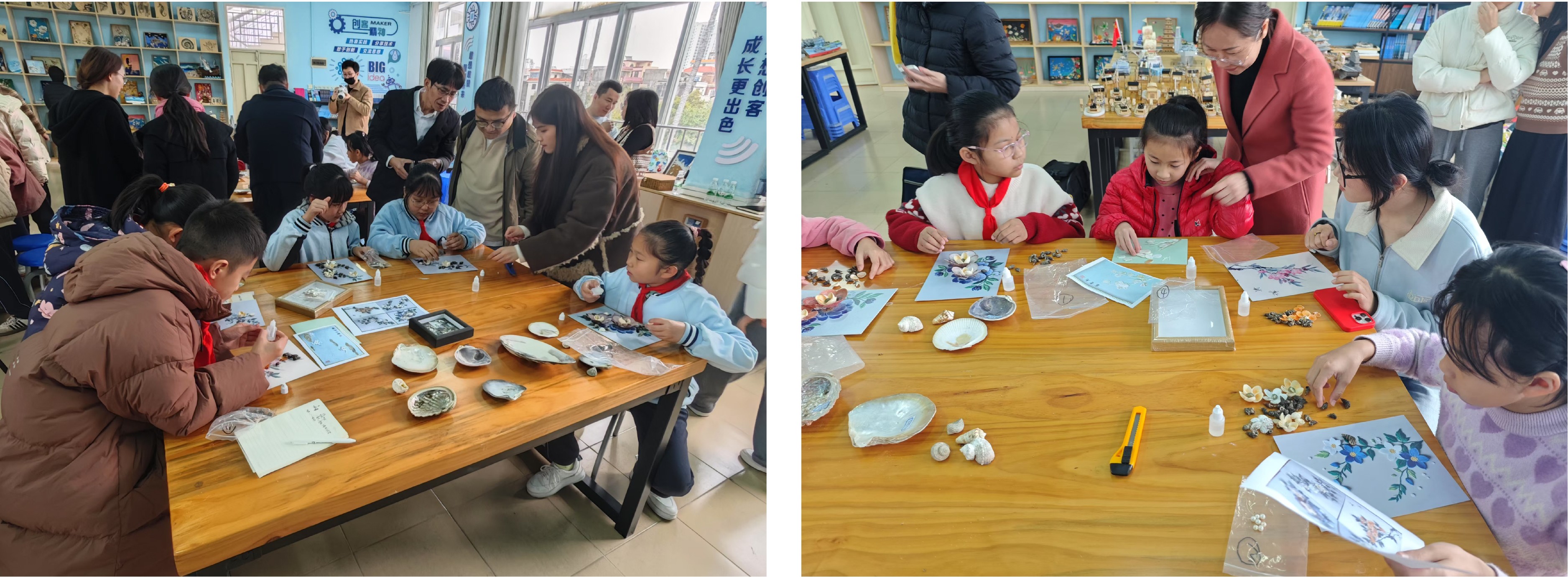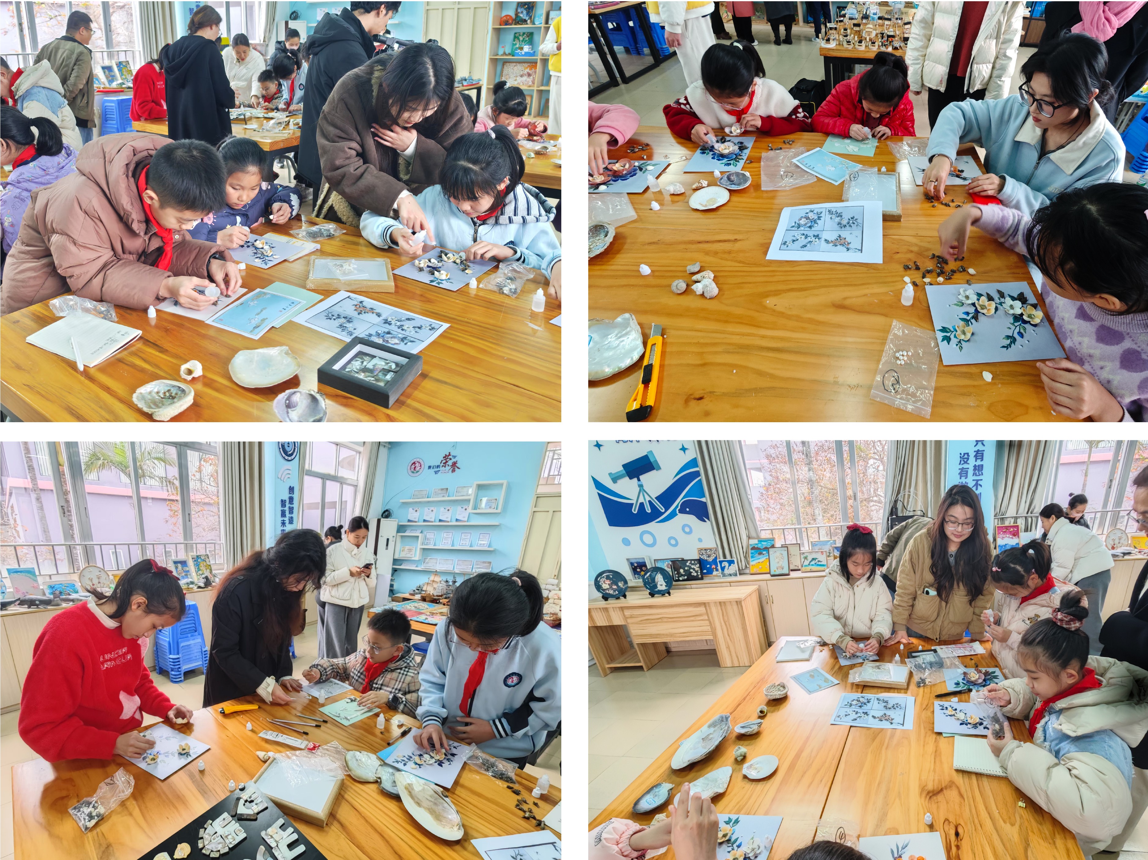 在互动体验环节,来自我校产品设计专业的四名23级同学担任起了“非遗小教师”的角色,学生们热情高涨,纷纷围在非遗小教师身边,跃跃欲试。在四位老师的耐心指导下,学生们拿起贝壳与工具,小心翼翼地开启创作之旅,依据贝壳的形状精心构思图案。不一会儿,一幅幅充满童趣的贝雕作品便在学生们手中诞生,这些作品凝聚着学生们的奇思妙想,更承载着他们对传统文化的理解和热爱。