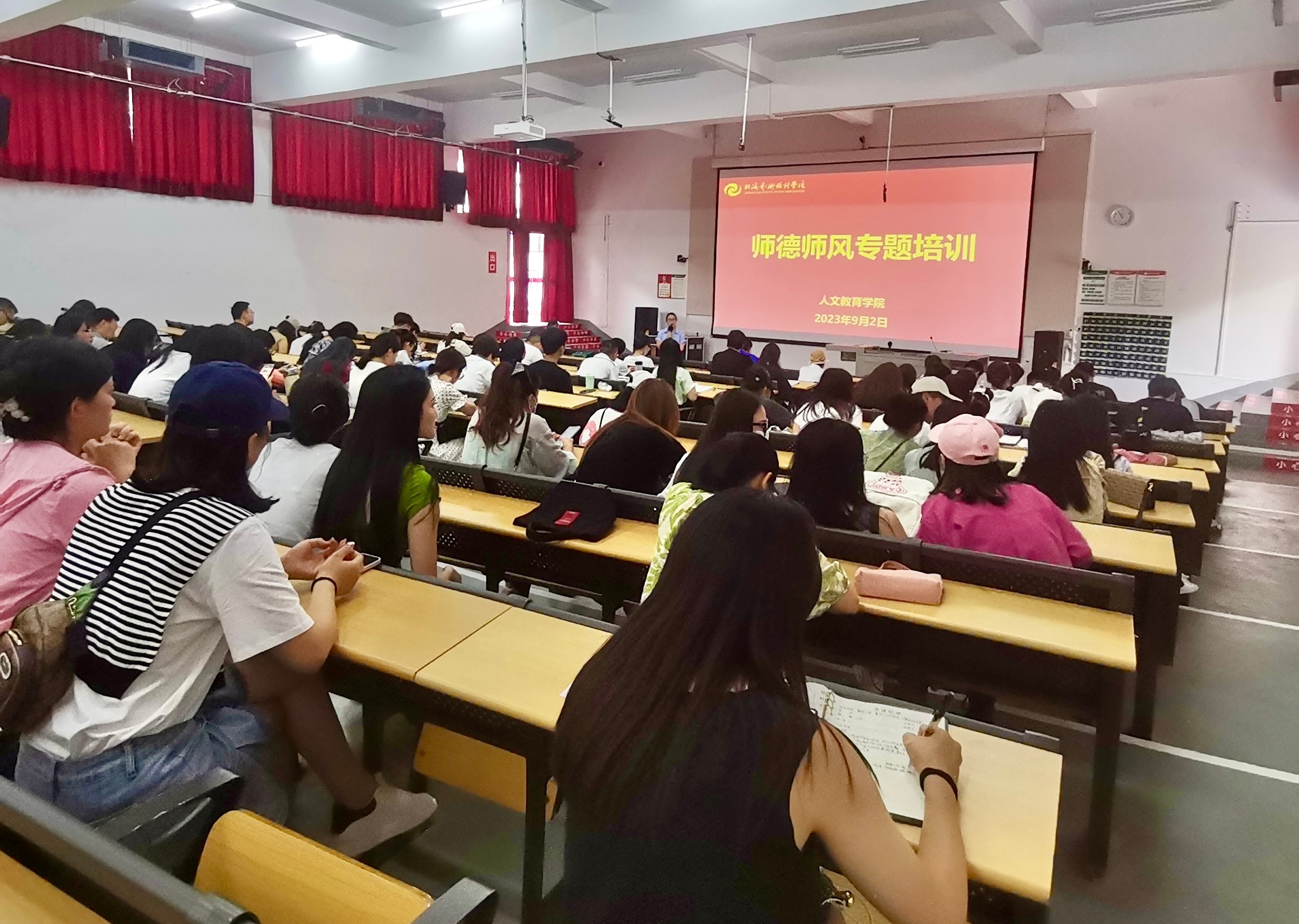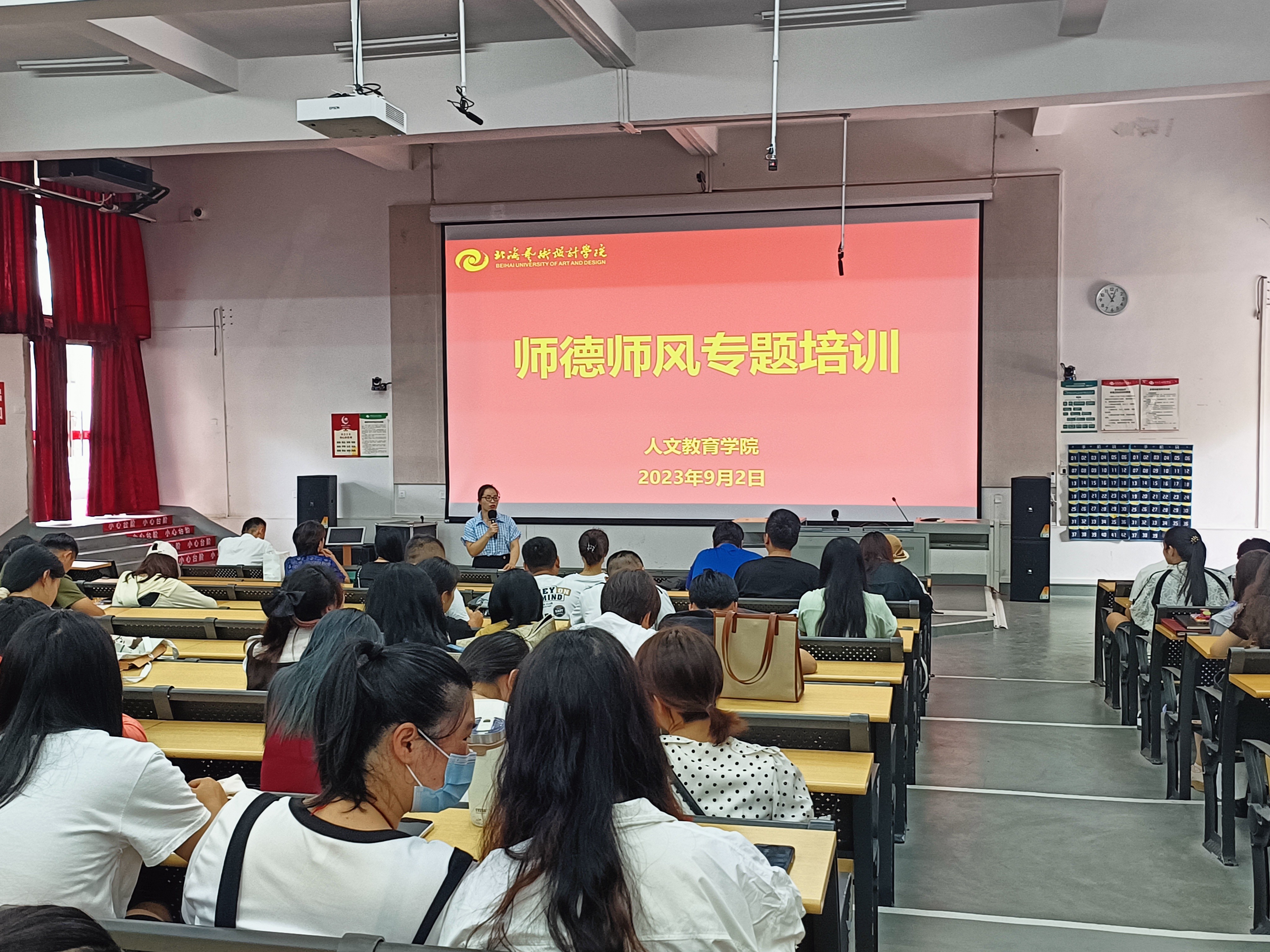 新学期伊始,为深入学习习近平新时代中国特色社会主义思想,贯彻落实习近平总书记关于教育的重要论述和指示批示精神,深入推进“清廉校园”建设落实师德师风第一标准,营造风清气正的育人环境我院于9月2日在公德楼107室,召开师德师风专题培训会,人文教育学院全体教职工参加会议,会议由学院综合办主任张碧蓉主持。