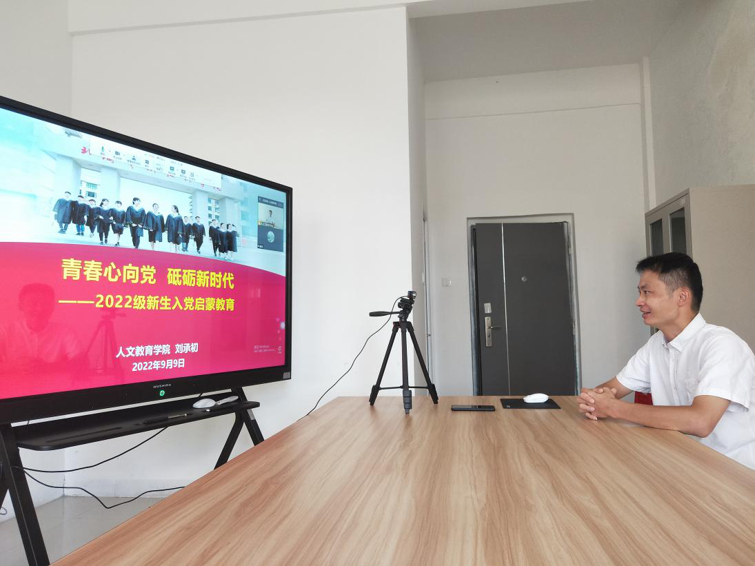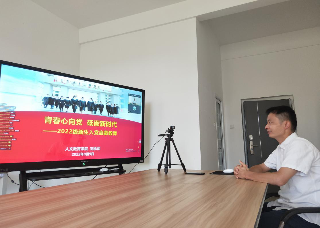 为深入学习贯彻习近平新时代中国特色社会主义思想和党的十九大、十九届历次全会精神以及自治区第十二次党代会精神,全面落实新时代党的建设总要求和新时代党的组织路线,落实立德树人根本任务,深入开展2022级新生党的基本知识教育,切实加强大学生思想政治教育,以优异成绩迎接党的二十大胜利召开,2022年9月9日,人文教育学院以线上视频会议的形式开展了主题为“青春心向党,砥砺新时代”新生入党启蒙教育讲座。本次讲座由我院党总支书记刘承初主讲,我院学工办主任谢伟主持。人文教育学院2022级全体新生参加了本次讲座。