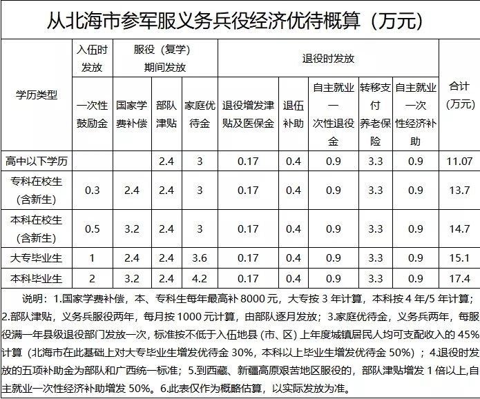 特别提醒:以下优待政策仅限从北海市各县区入伍才能享受。