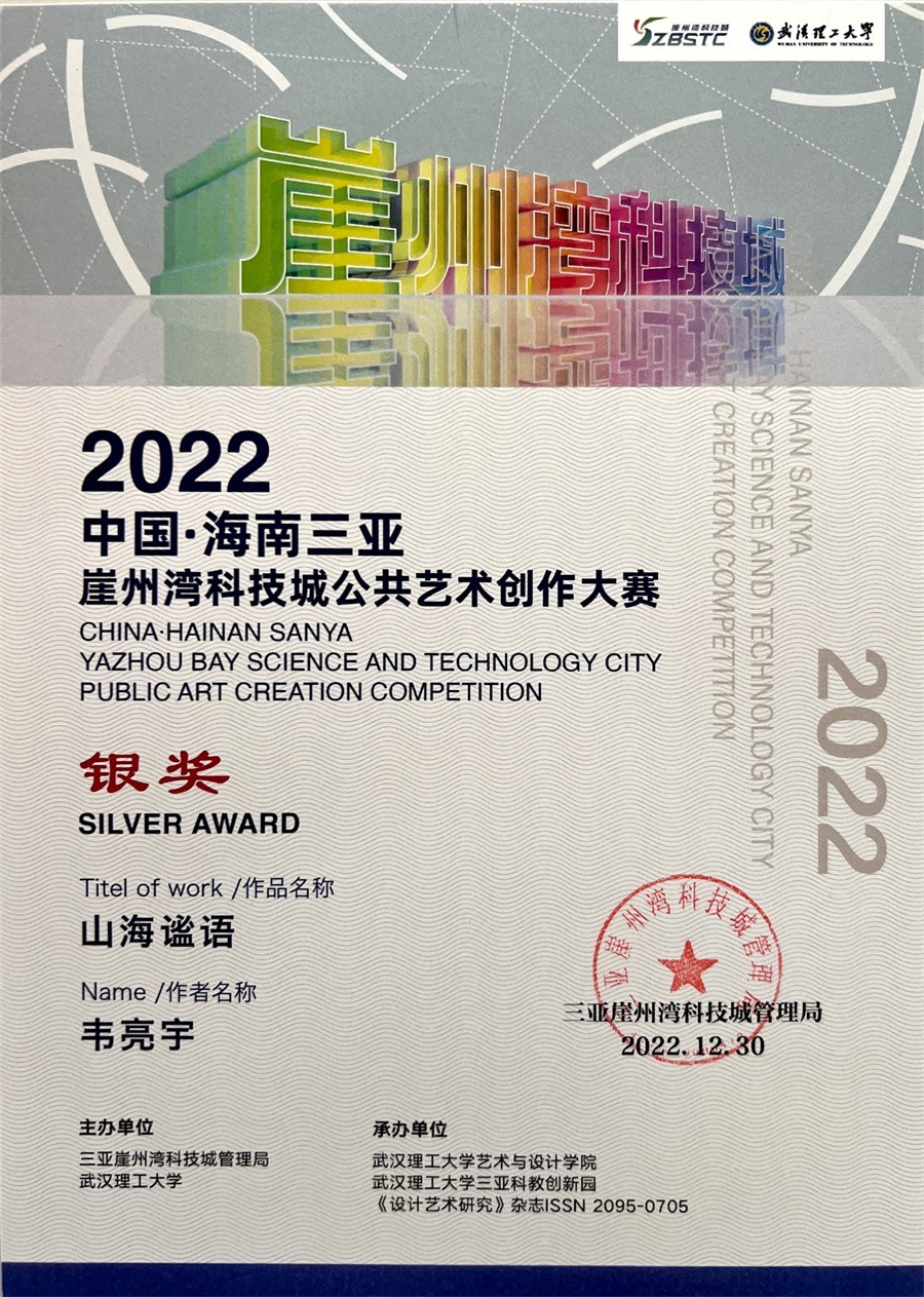 近日,由三亚崖州湾科技城管理局和武汉理工大学主办,《设计艺术研究》ISSN2095-0705杂志和武汉理工大学三亚科教创新园承办的2022中国·海南三亚崖州湾科技城公共艺术创作大赛圆满落下帷幕。我校建筑与环境艺术学院青年教师韦亮宇作品《山海谧语》在大赛终评活动中荣获银奖。